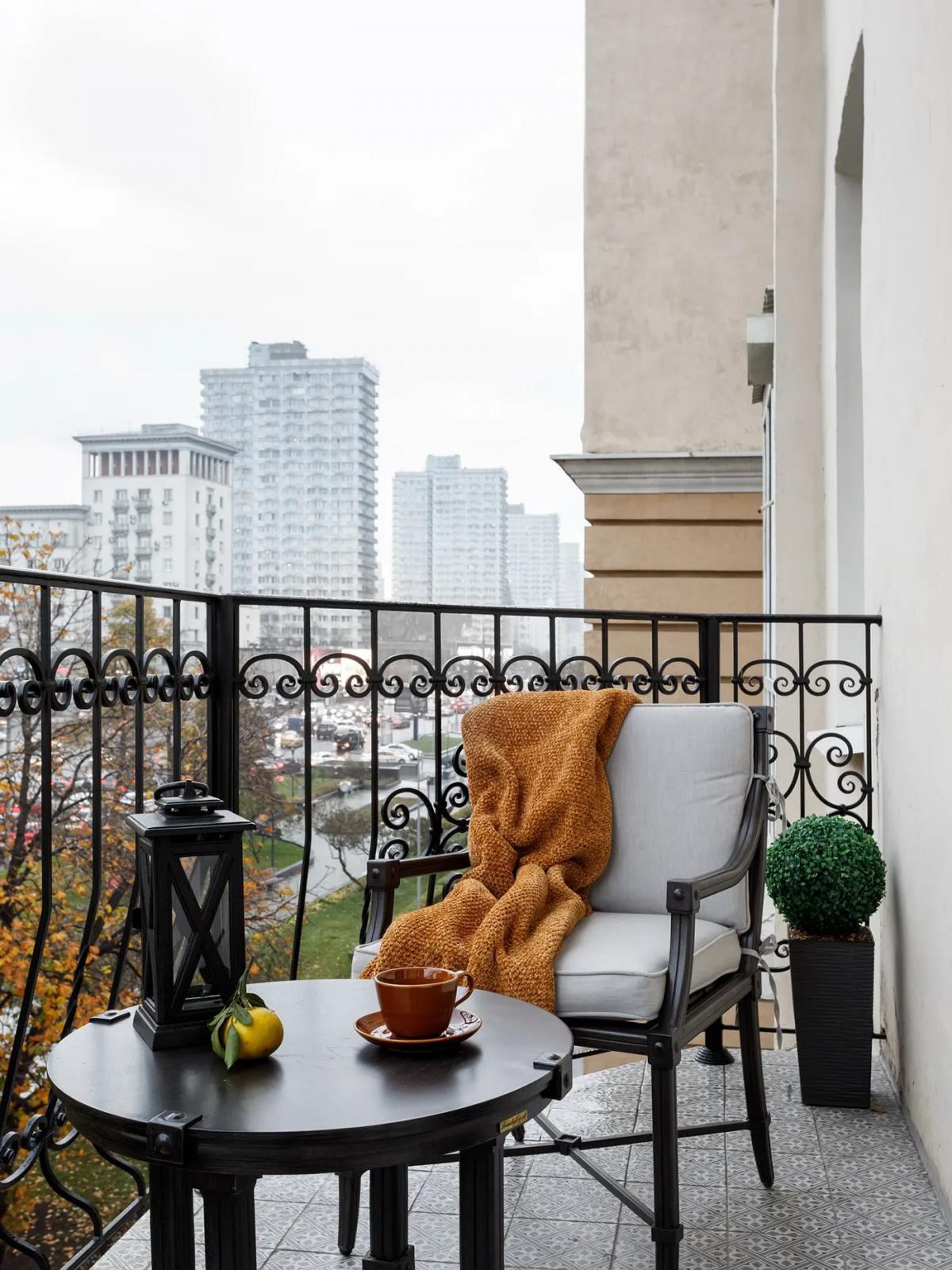 Дизайнер интерьеров Ольга Цурикова красиво и стильно обустроила открытый балкон в квартире на Старом Арбате в Москве. Без растений и гирлянд, но с уютной зоной для вечернего отдыха.