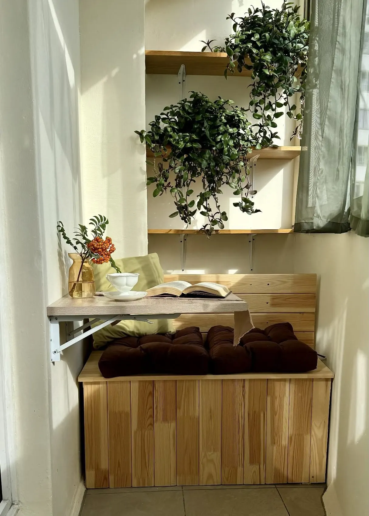- Обустроила уголок для утреннего кофе и чтения. Для него заказала на маркетплейсе приставную столик-полку и сделала скамейку из обычных досок, покрытых лаком. Под скамейкой расположено место для дополнительного хранения вещей.