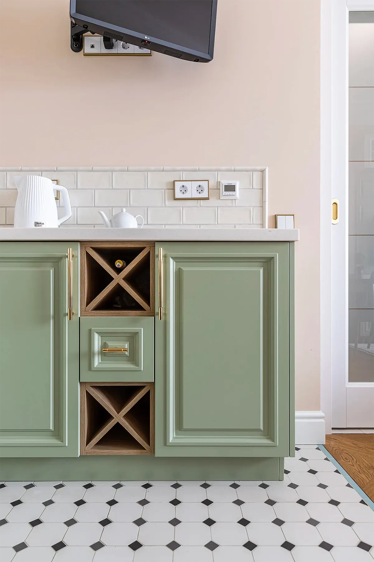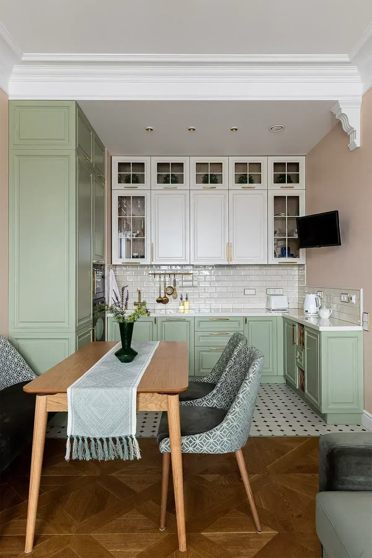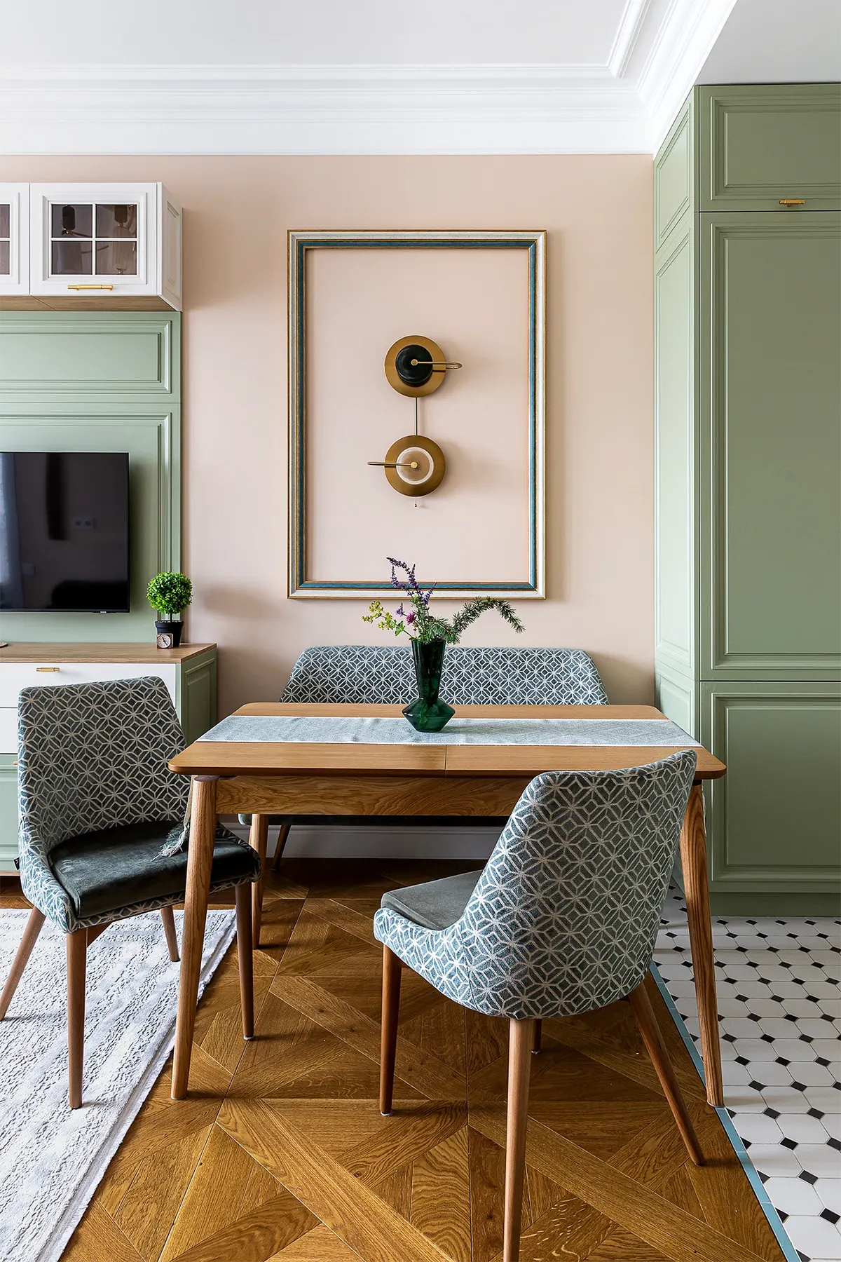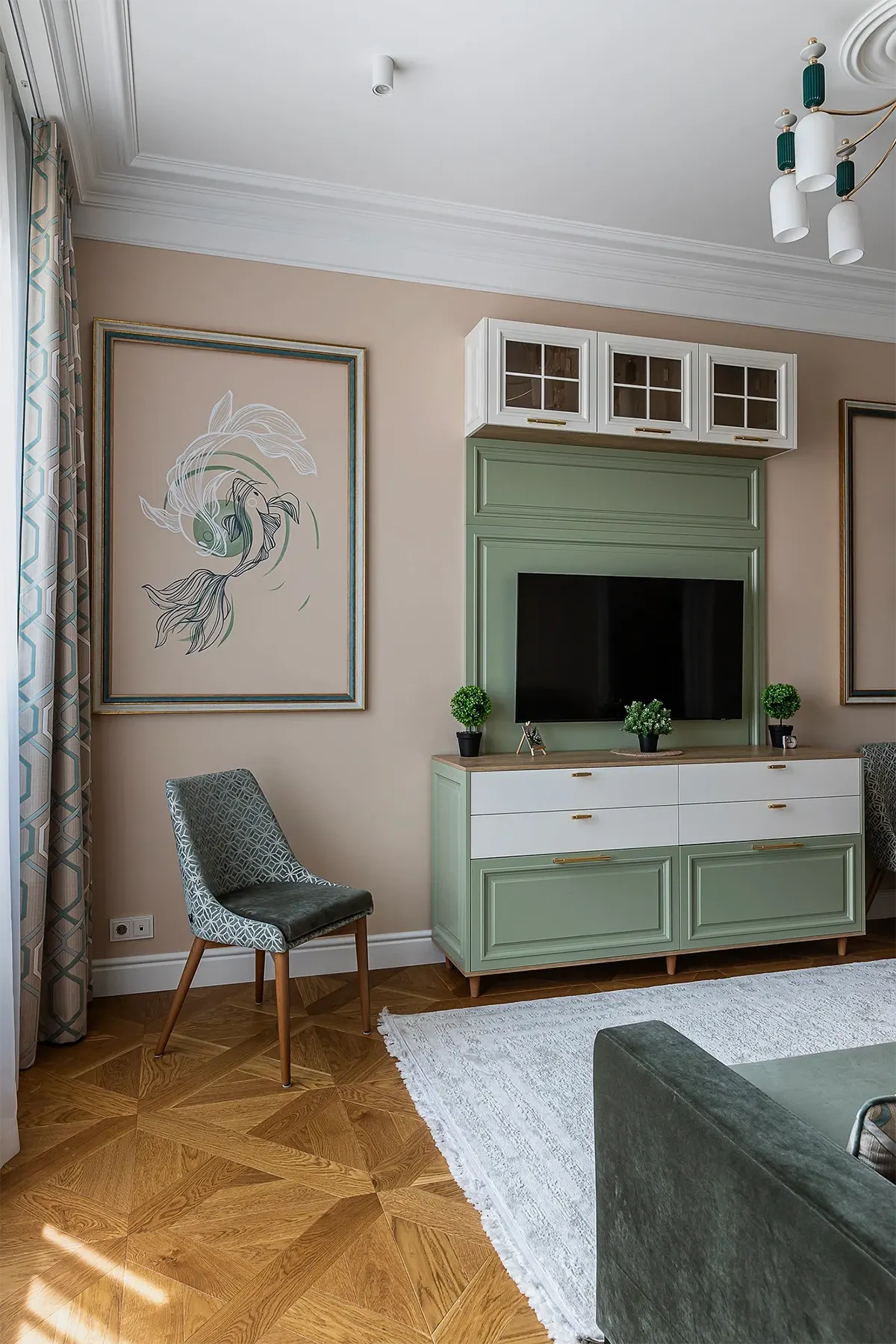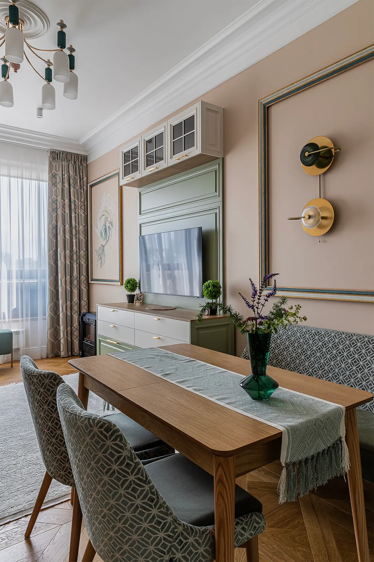 В интерьере доминируют три цвета: все оттенки зеленого, дерево и белый (ближе к молочному), который выступает в роли объединяющего элемента.