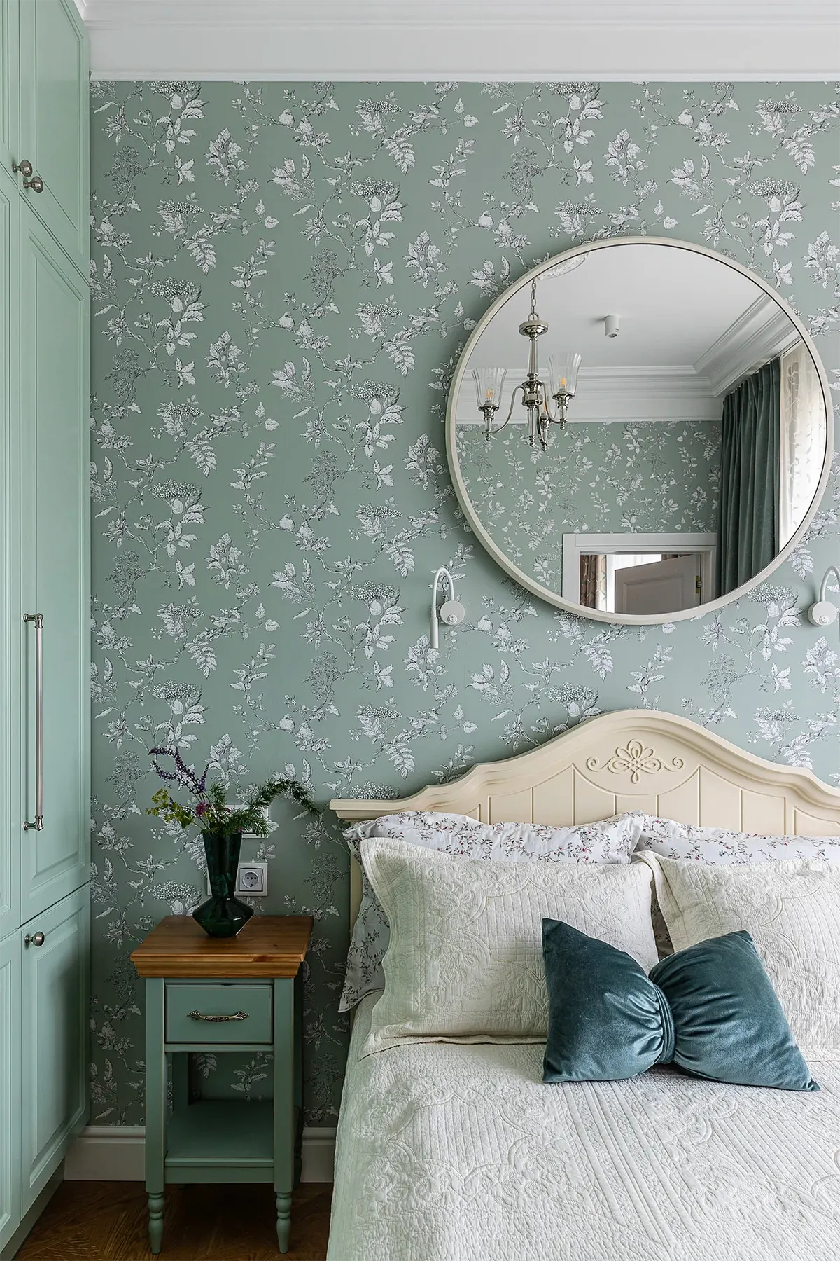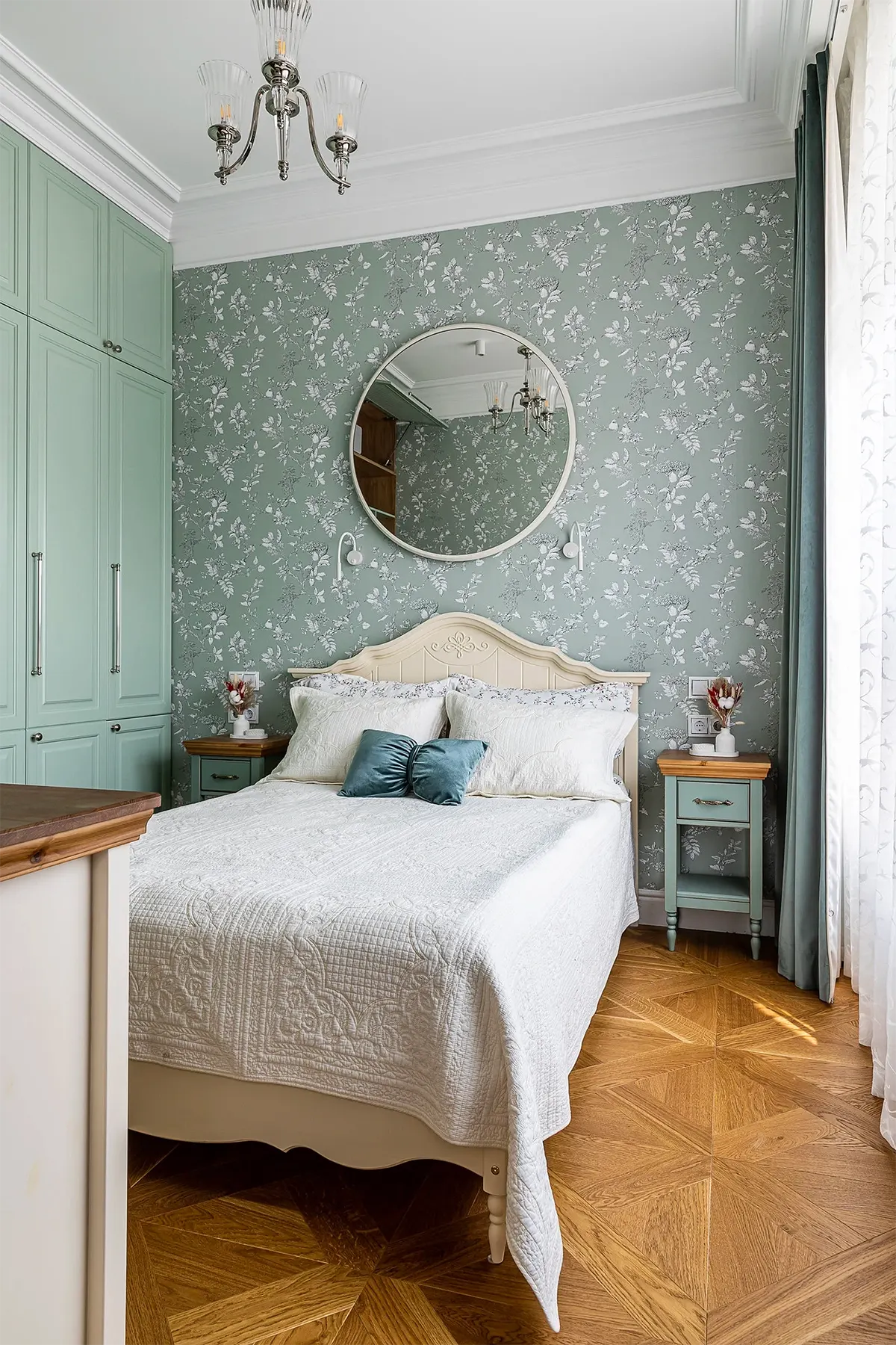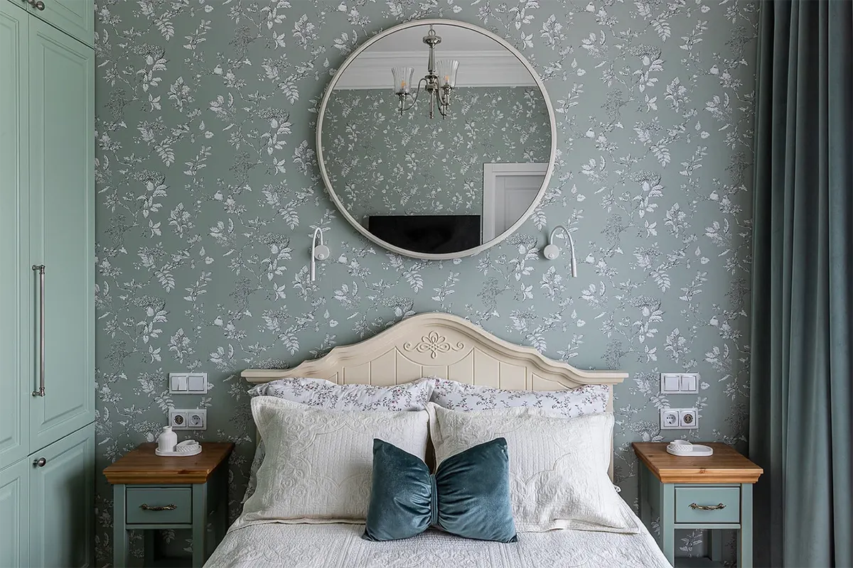 Зеркало над кроватью визуально расширяет пространство и делает комнату более солнечной, отражая свет из окна.