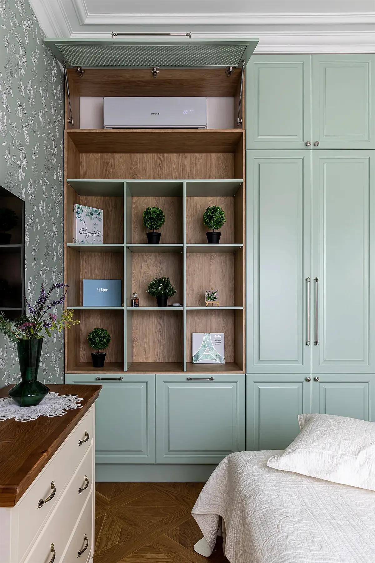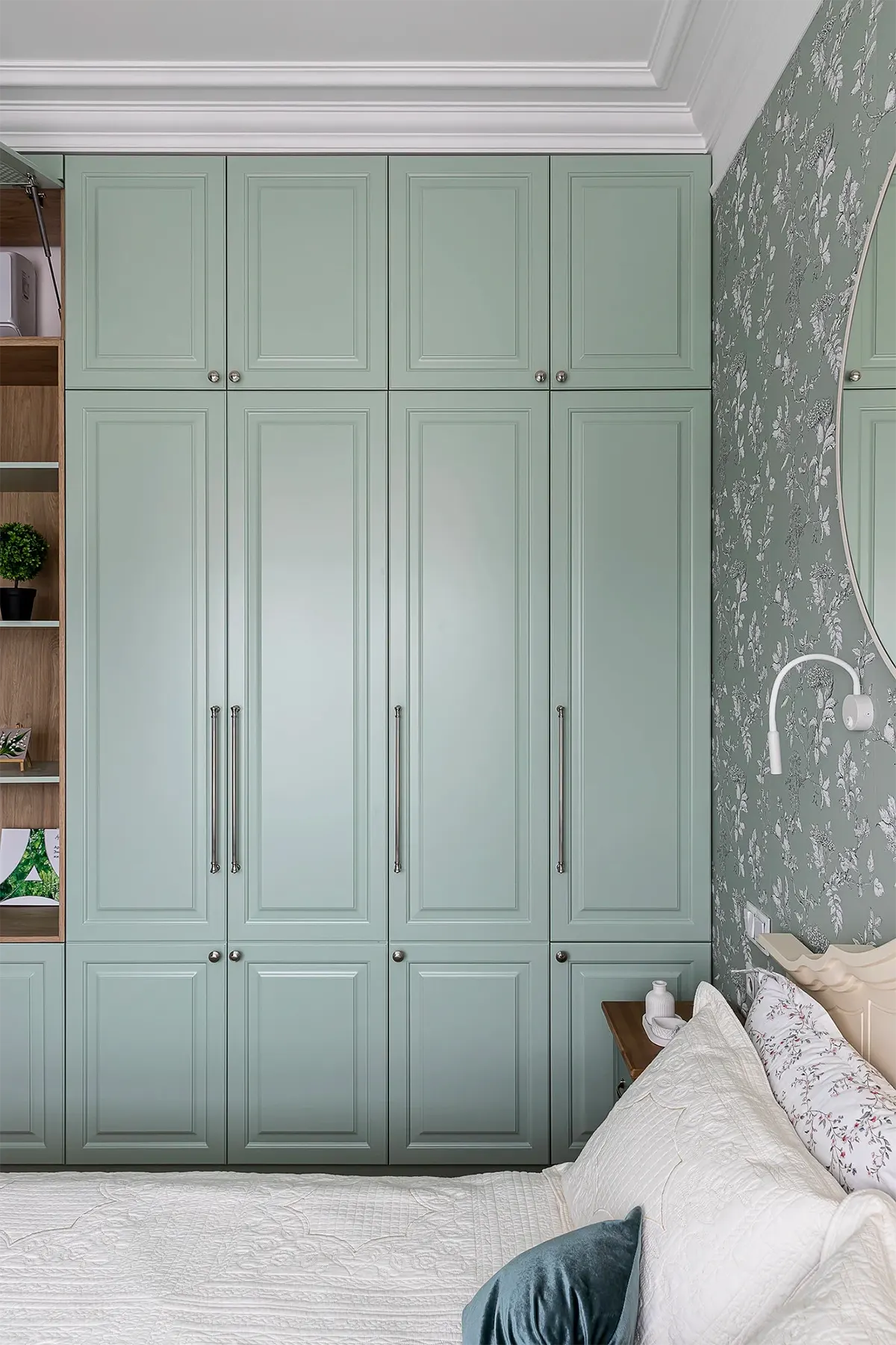 Вся одежда (кроме обуви и верхней одежды) хранится в этом шкафу от Rubicks. Его покрасили в оттенок обоев от бренда Aura. Шкаф довольно громоздкий — во всю стену, но благодаря визуальному оформлению он не перегружает пространство.