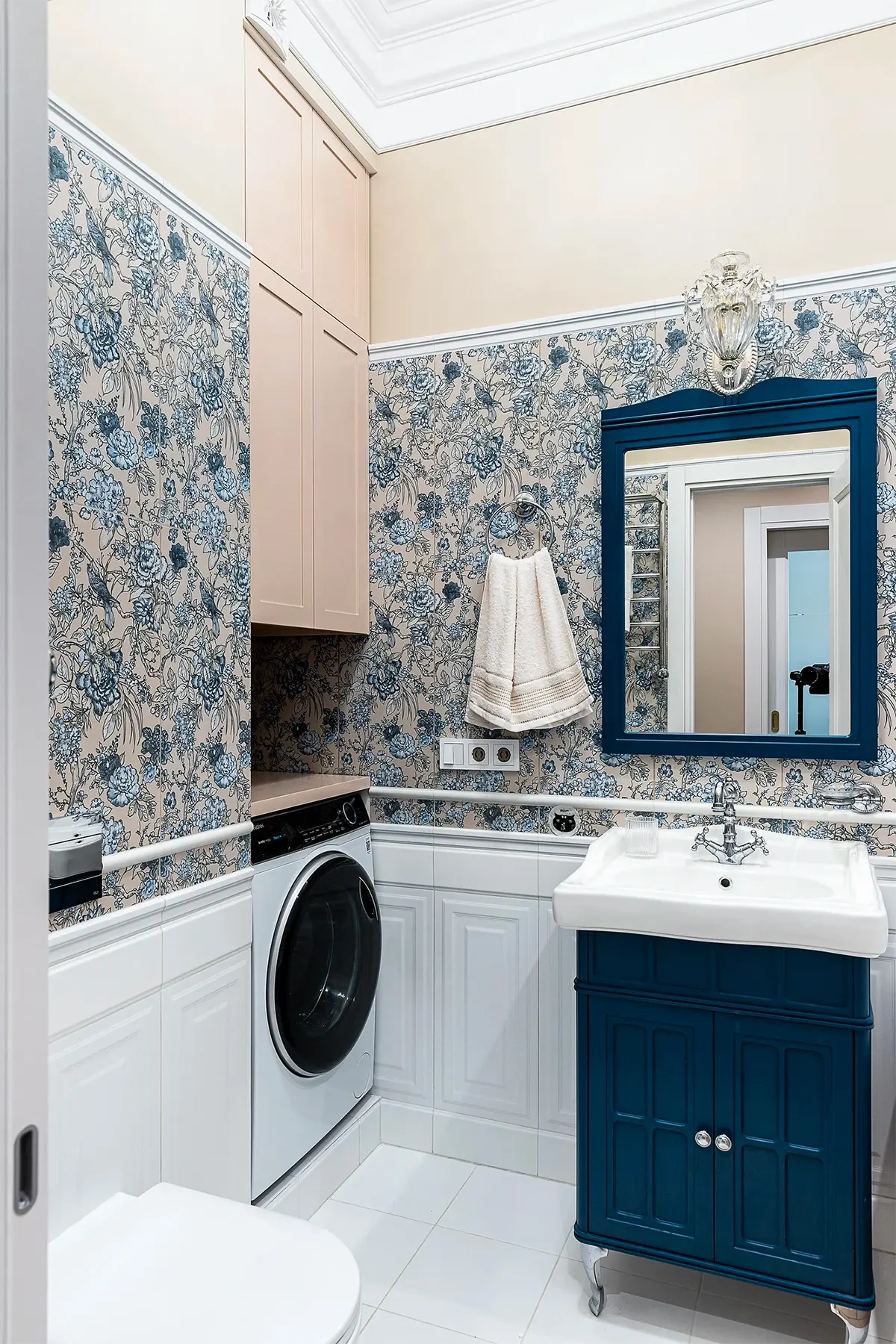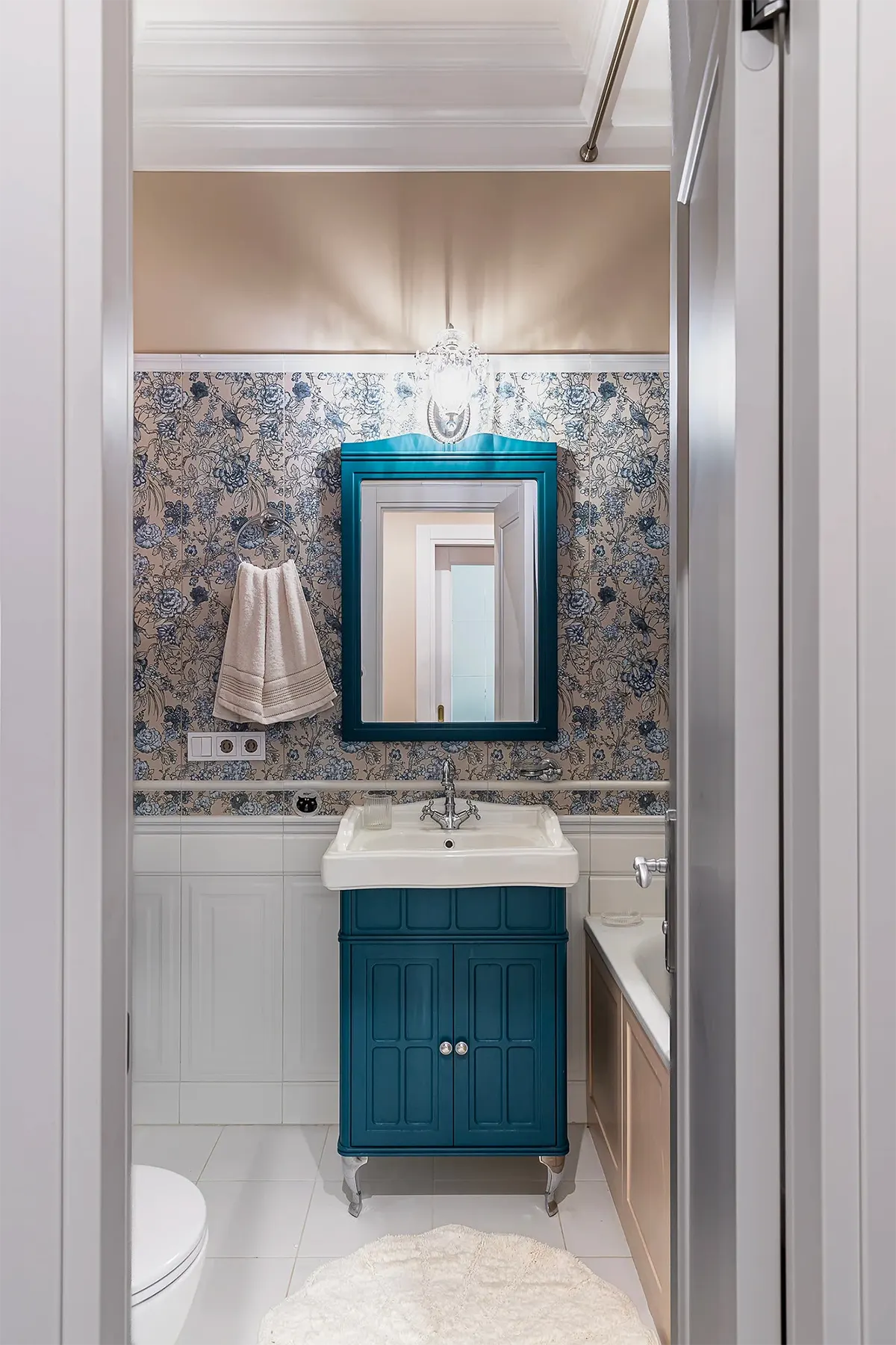 На стенах в ванной комнате — плитка Kerama Marazzi, имитирующая шелковые обои. Таким образом дизайнер решила разбавить классический стиль, доминирующий в квартире, китайским шинуазри.