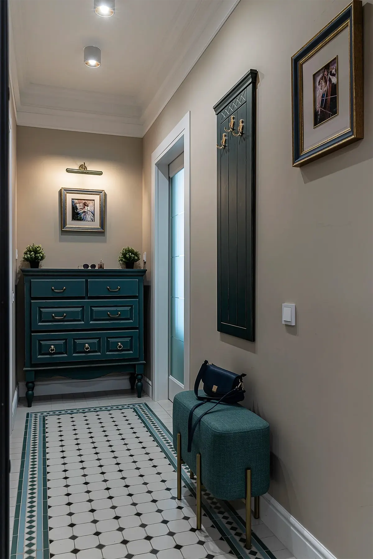 В прихожей есть ниша, где установлен ультрамариновый комод от мебельного бренда «Белый воск». Изначально в этом месте располагался вход в спальню. Его закрыли, а на стену повесили картину с дополнительной подсветкой.