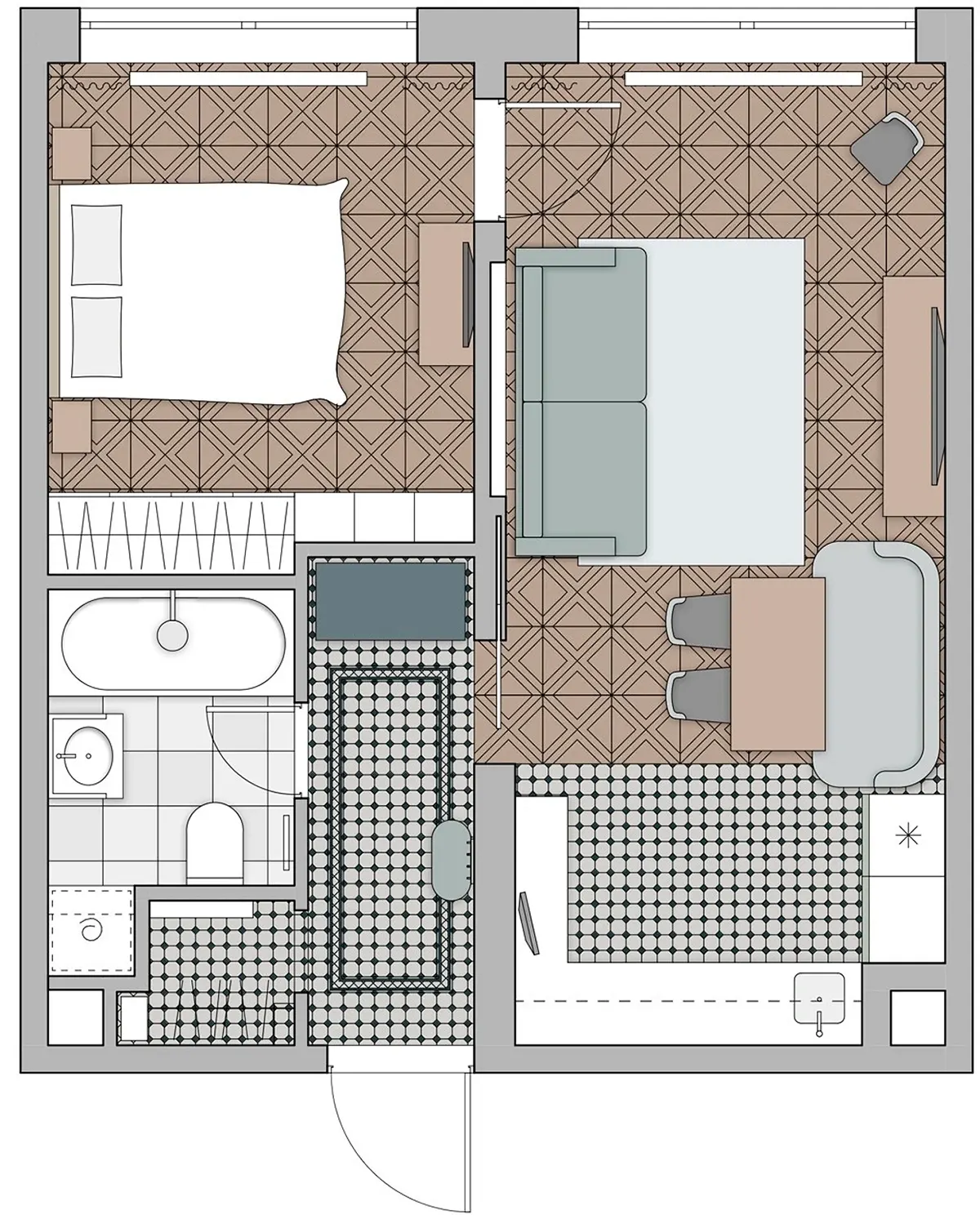 Вещей крайне мало, но интерьер выглядит многослойным. Причина кроется в геометрии. Татьяна Ильина-Сорокина использовала здесь один из своих любимых приемов: английскую решетку в мебели (ее можно увидеть в оформлении комода и кухонного гарнитура), которая создает дополнительный уют, добавляет масштаб пространству и воссоздает атмосферу фамильного дома.