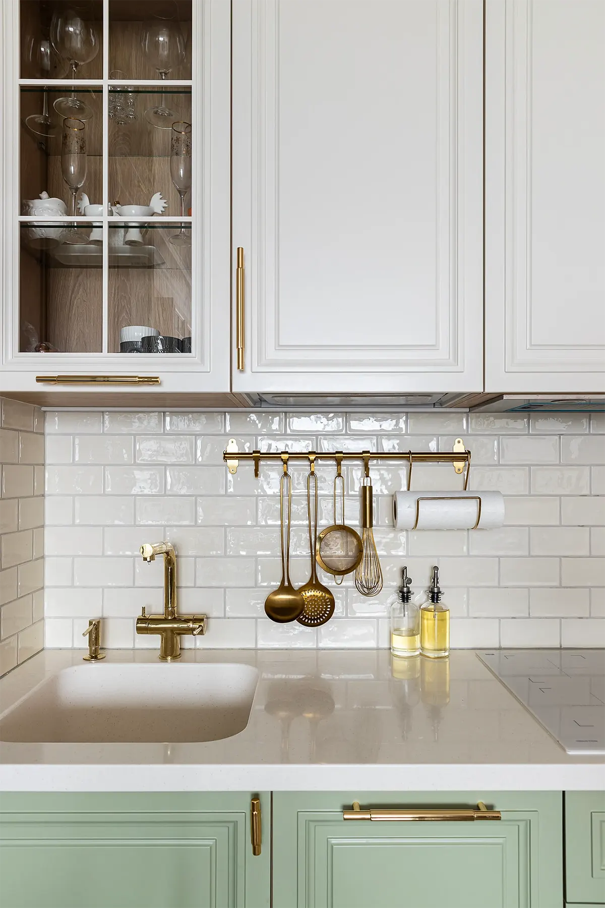 Вся фурнитура, как и другие маленькие детали в зоне готовки (например, держатель для столовых приборов на рейлинге), подобраны в золотистых оттенках.