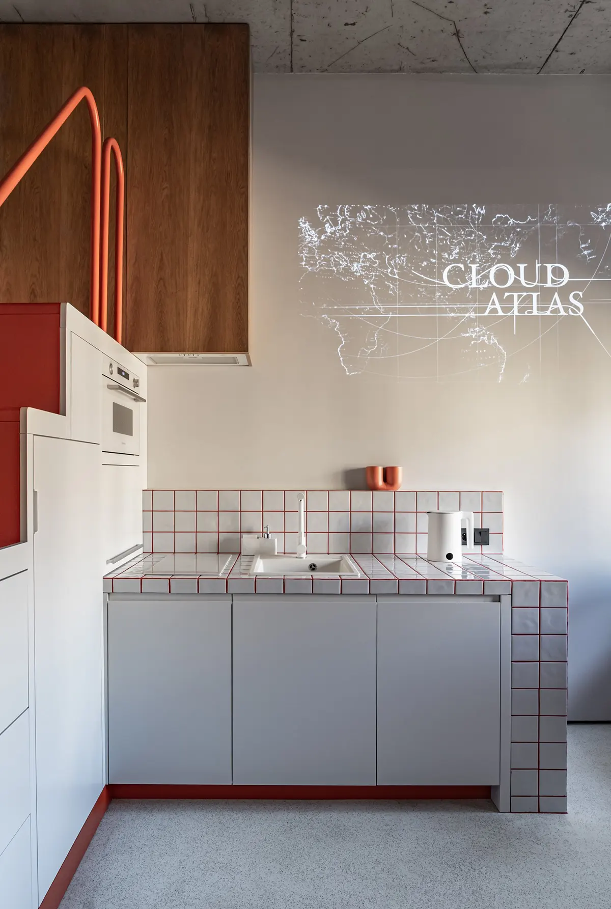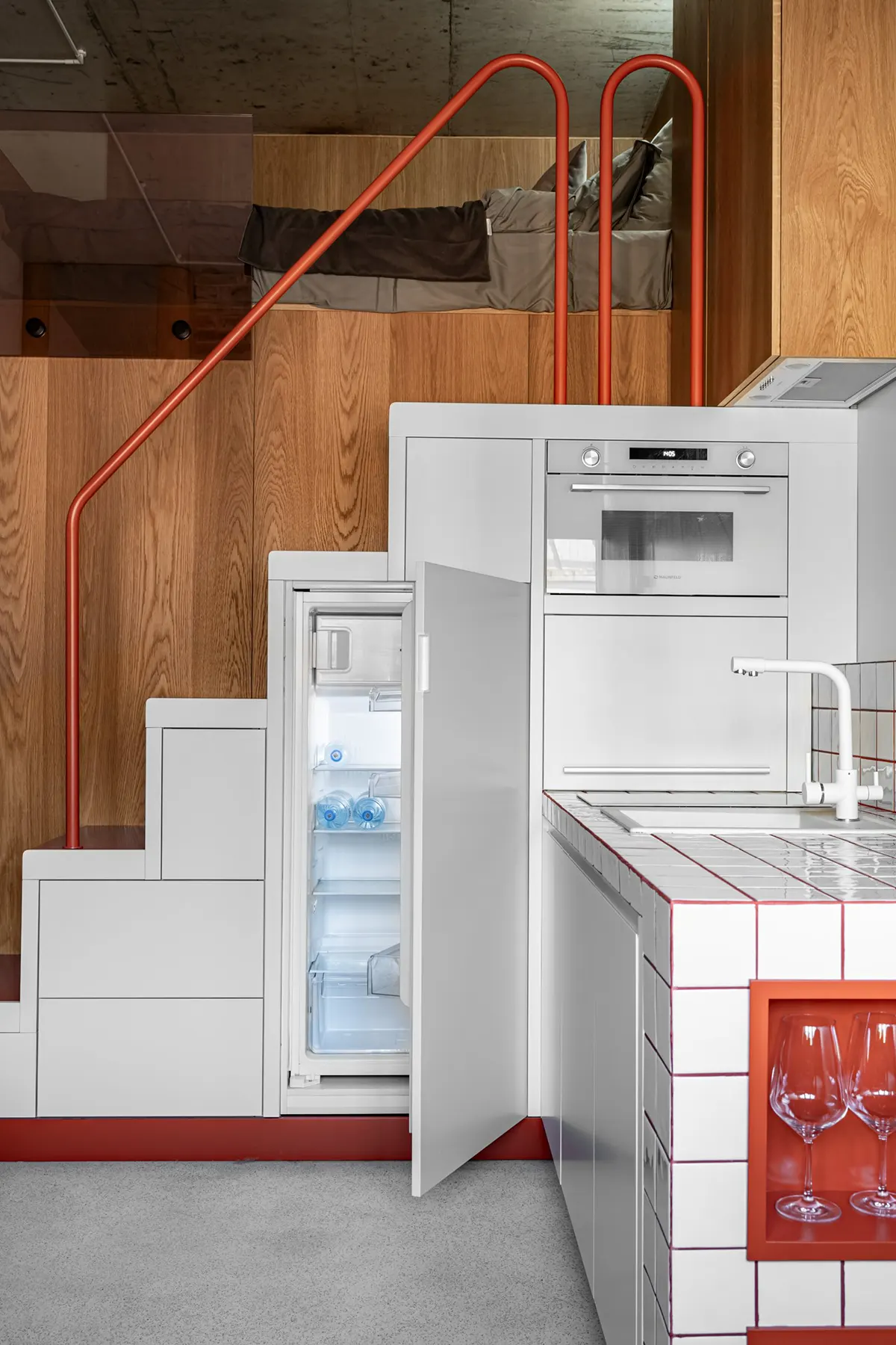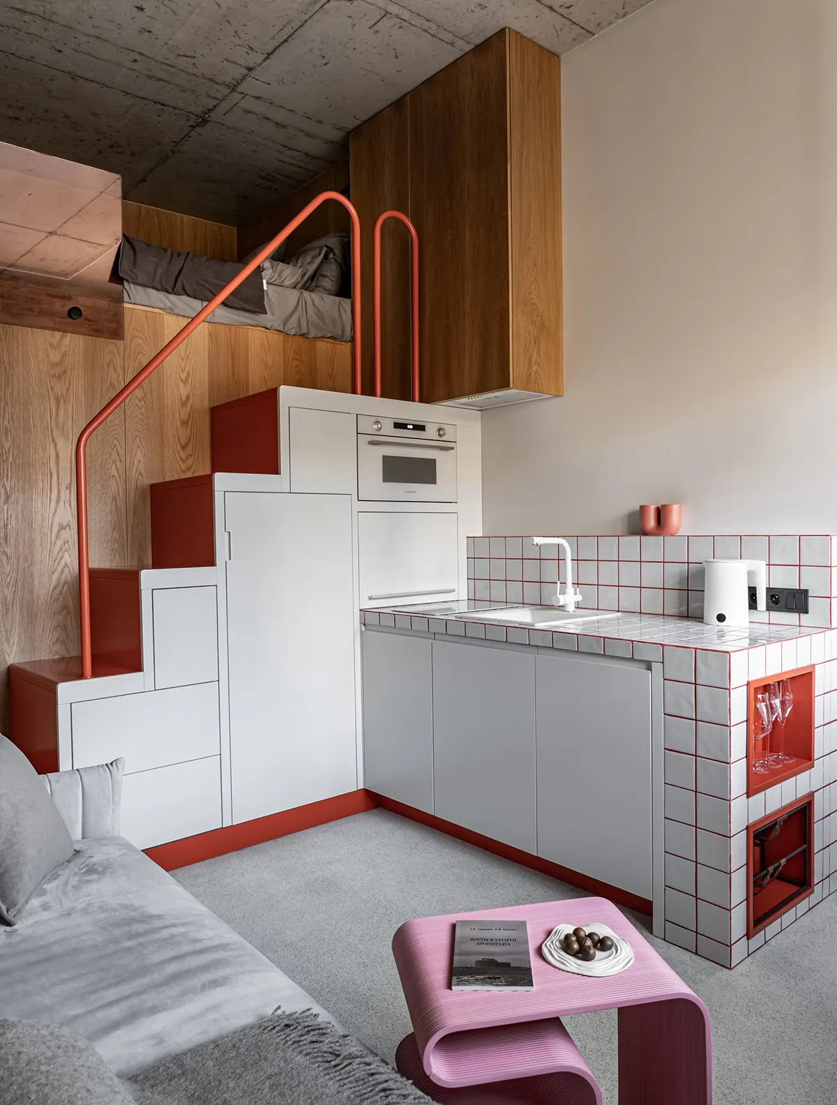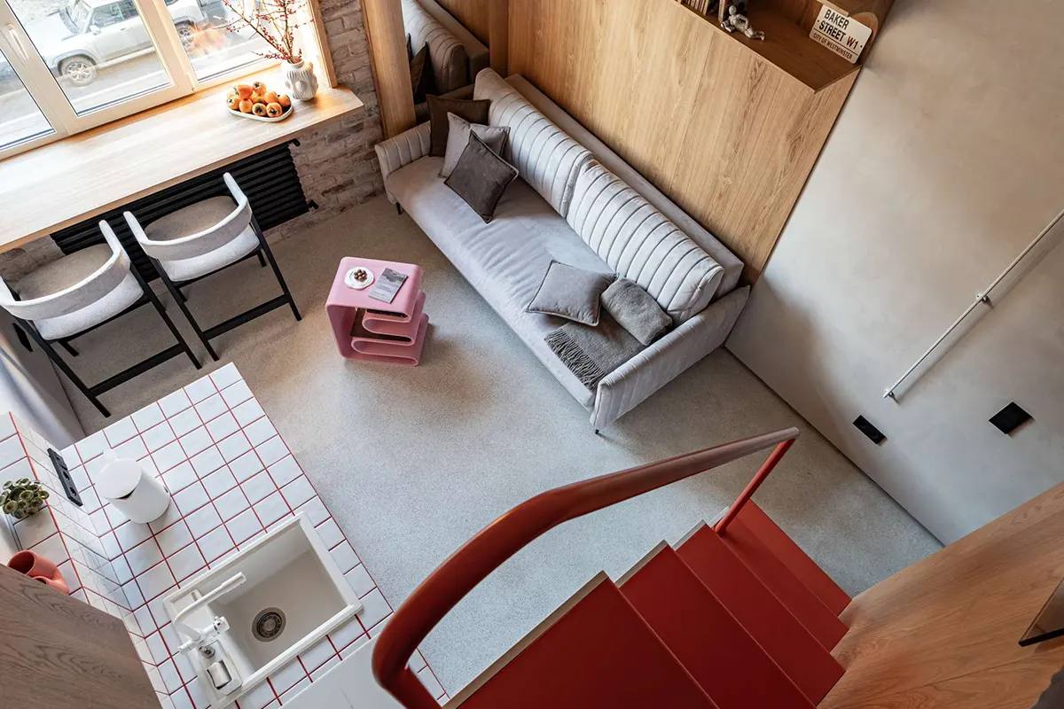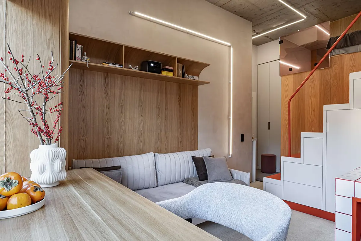 Лестничный блок, который ведет на жилую антресоль, совместили с кухней. Там расположены места хранения и встроенная бытовая техника.