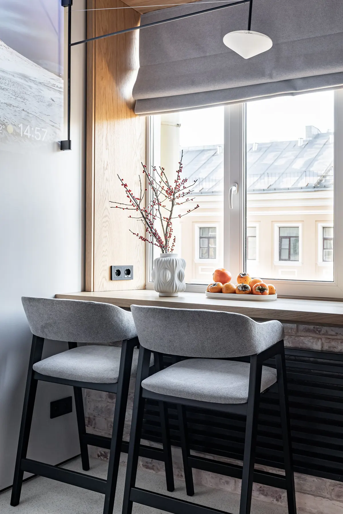 Также сэкономить квадратные метры удалось за счет грамотного планирования пространства: вместо телевизора установили проектор, а роль обеденного стола выполняет широкий подоконник.