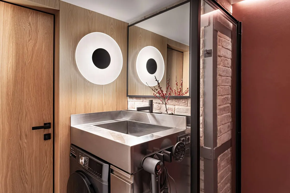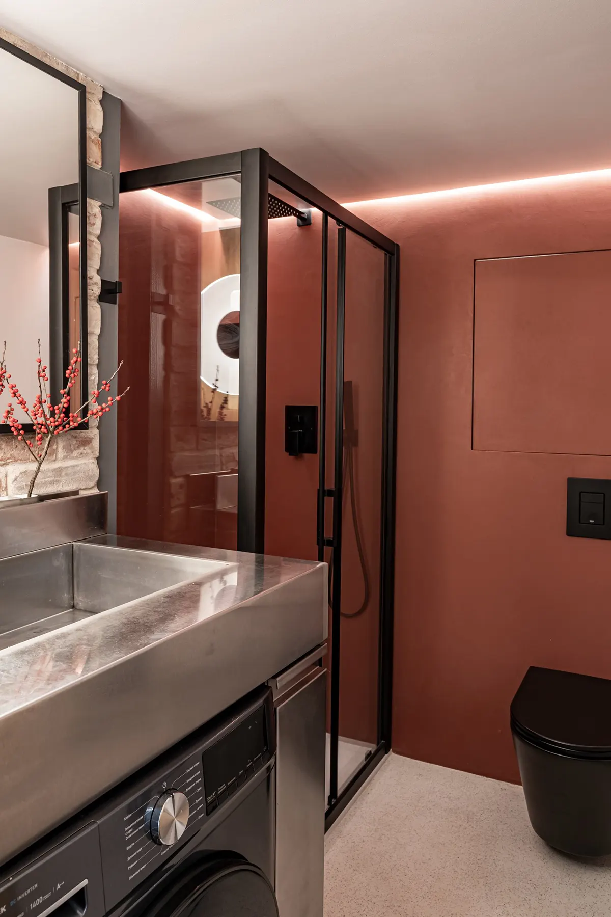 Раковина в ванной комнате сделана на заказ из нержавеющей стали. Мастера нашли на Авито.