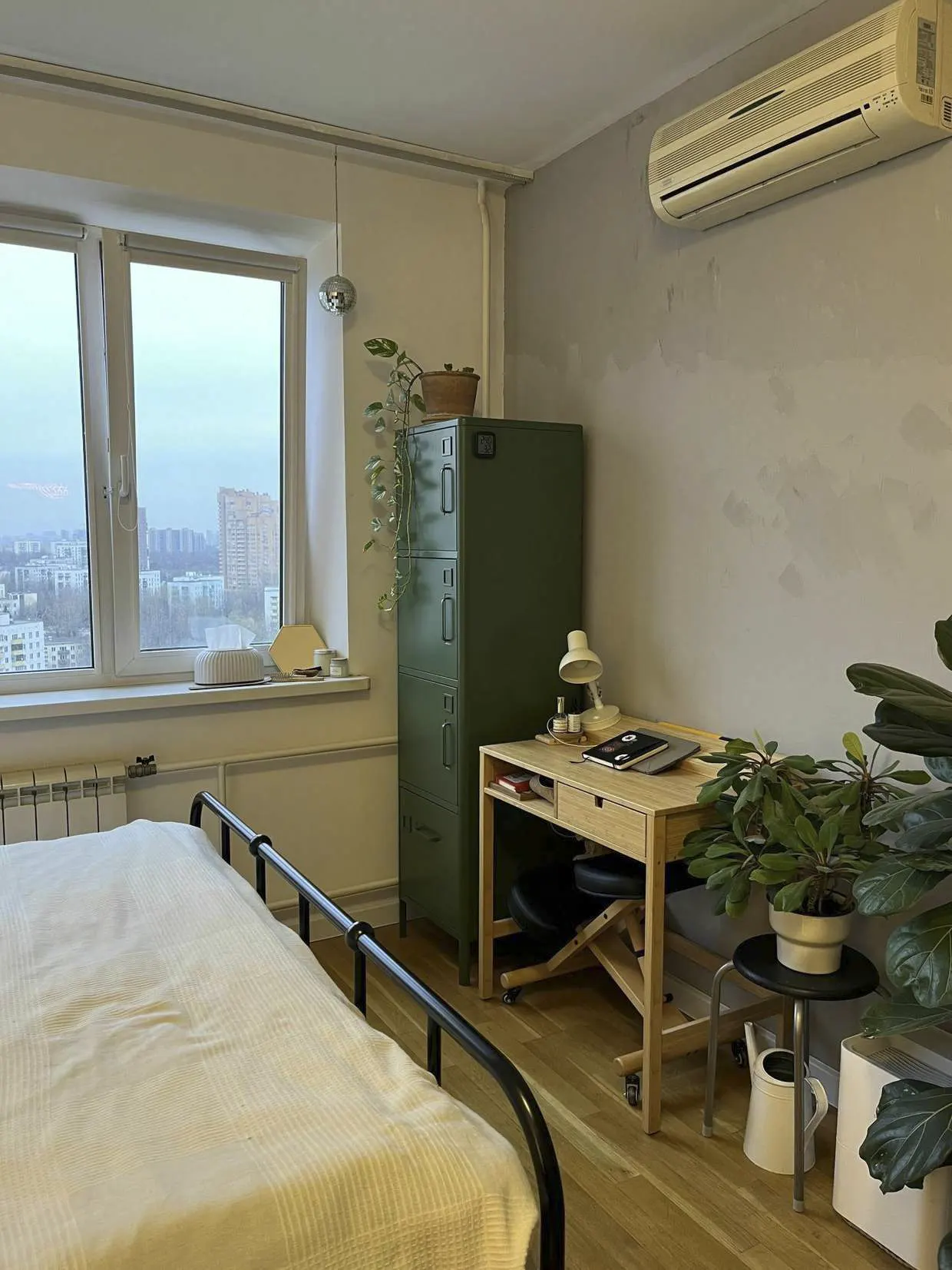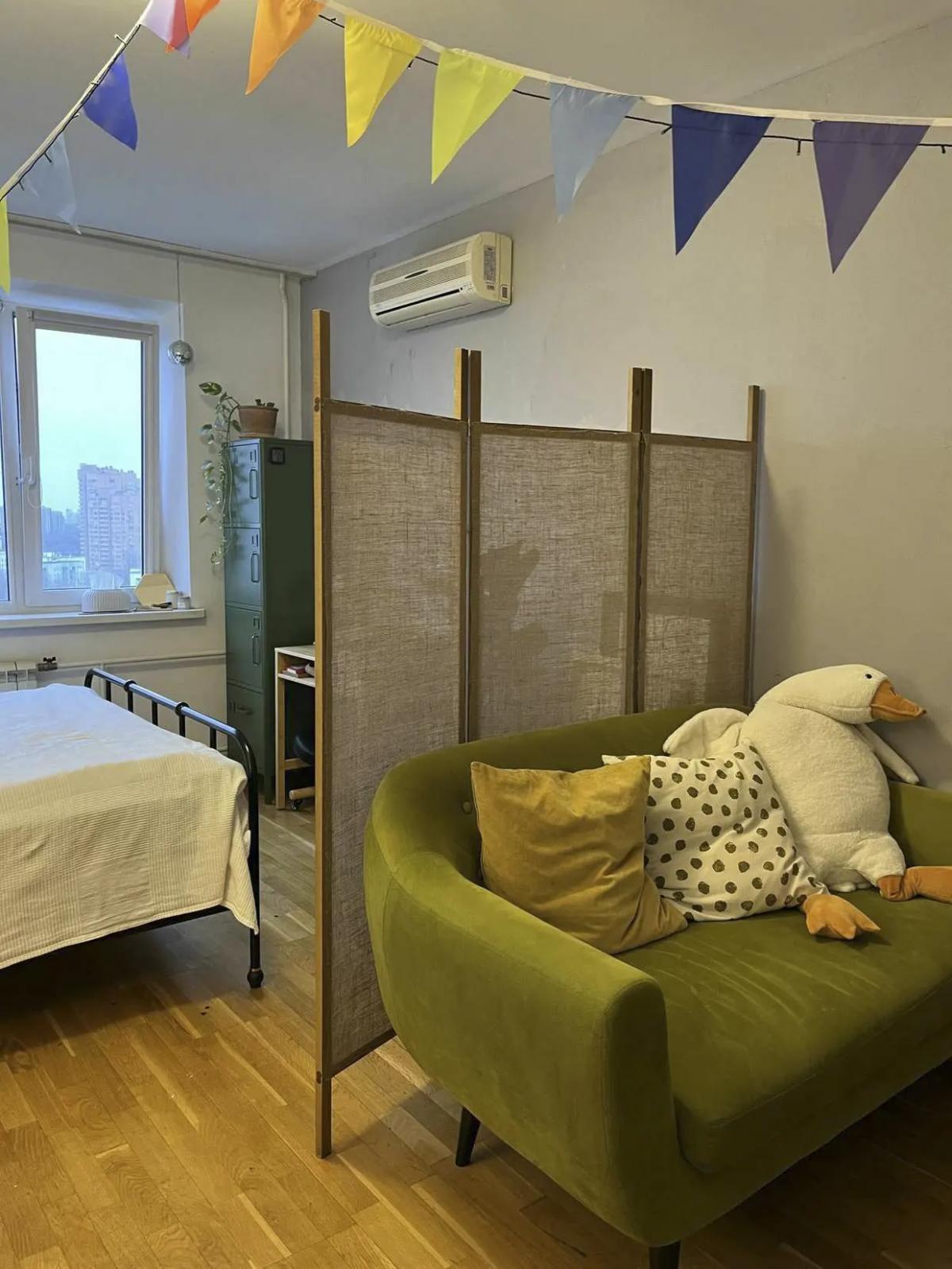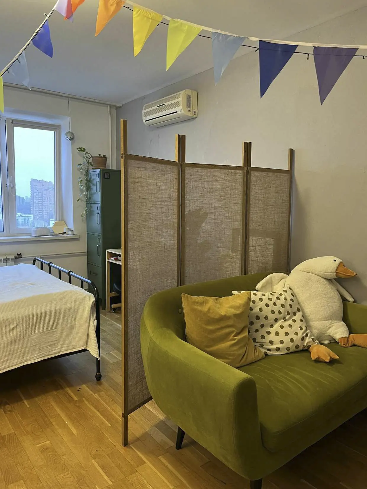 В итоге единственную комнату разделили ширмой на две зоны: получилась отдельная спальня и мини-гостиная для просмотра фильмов.