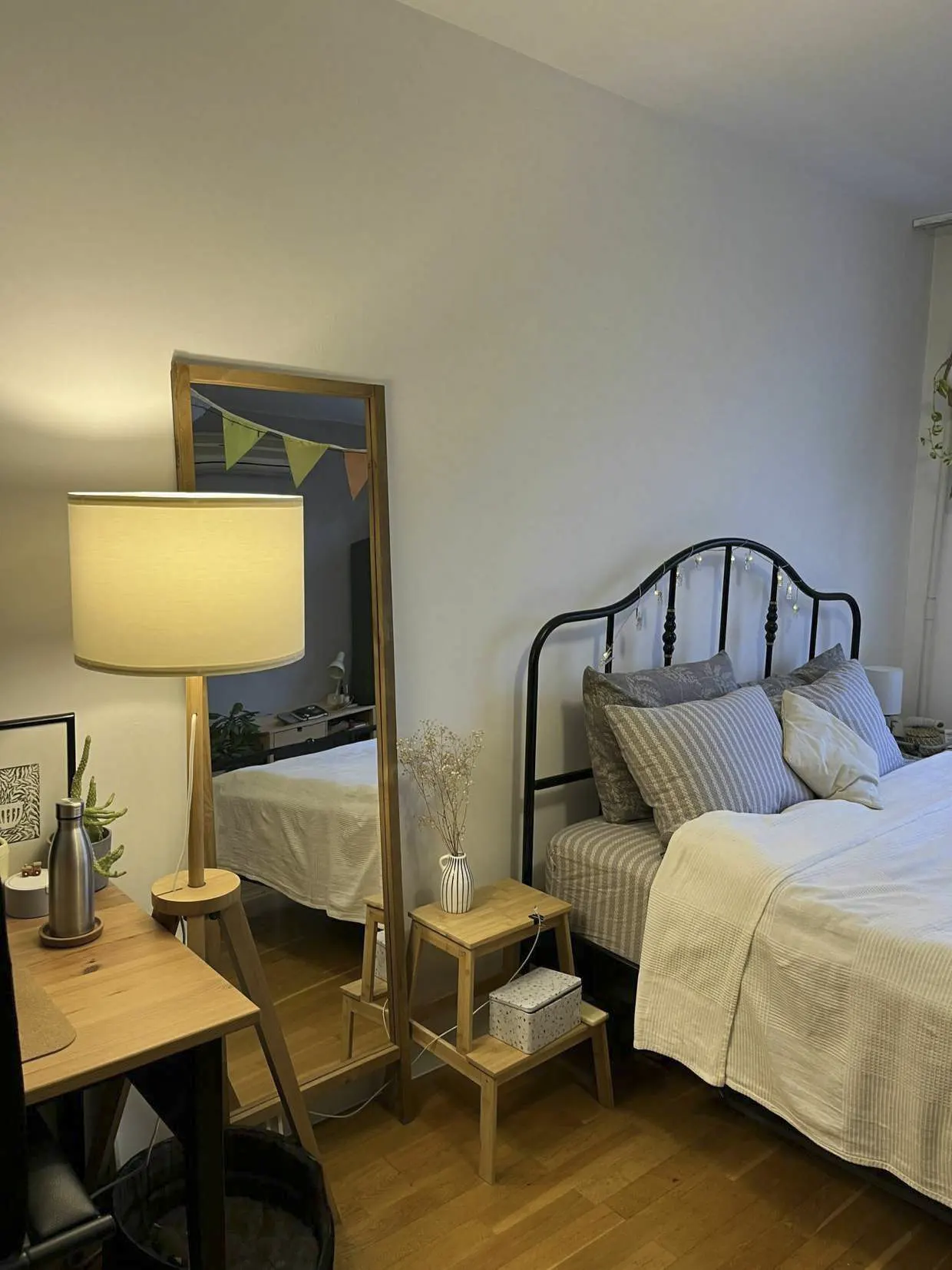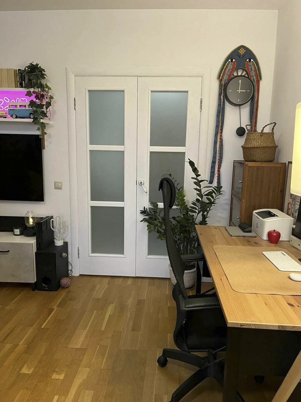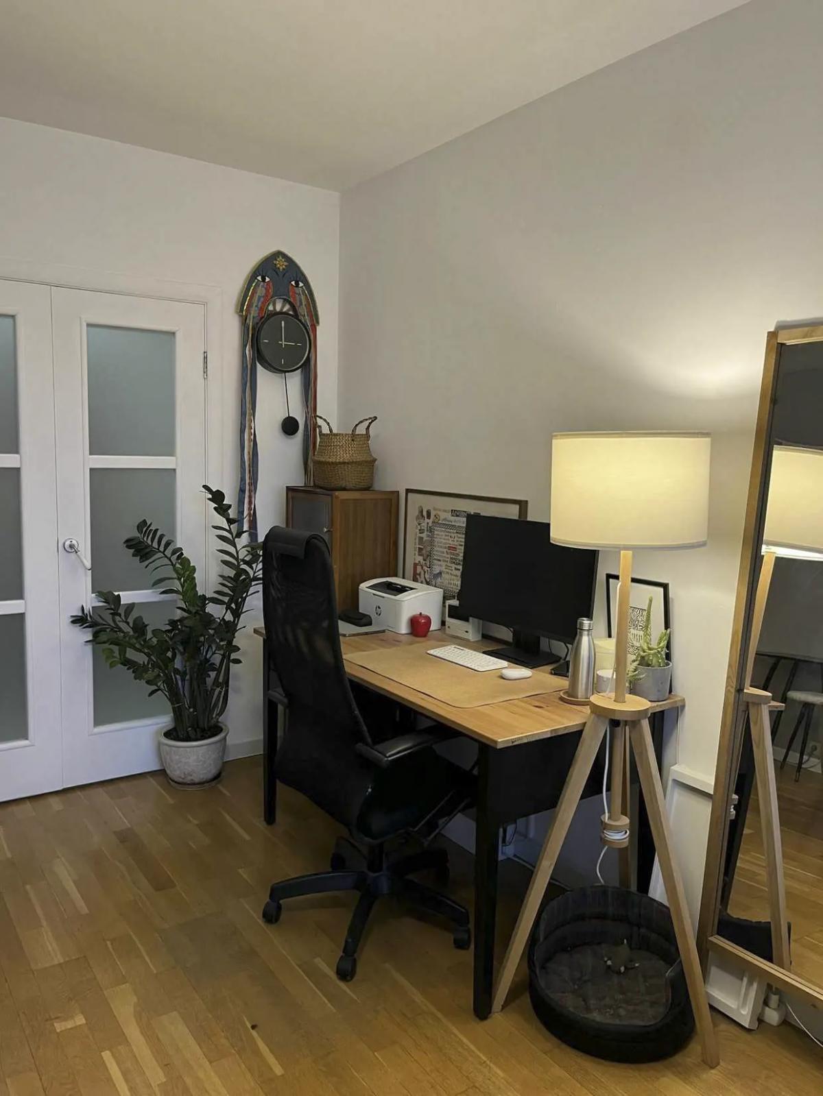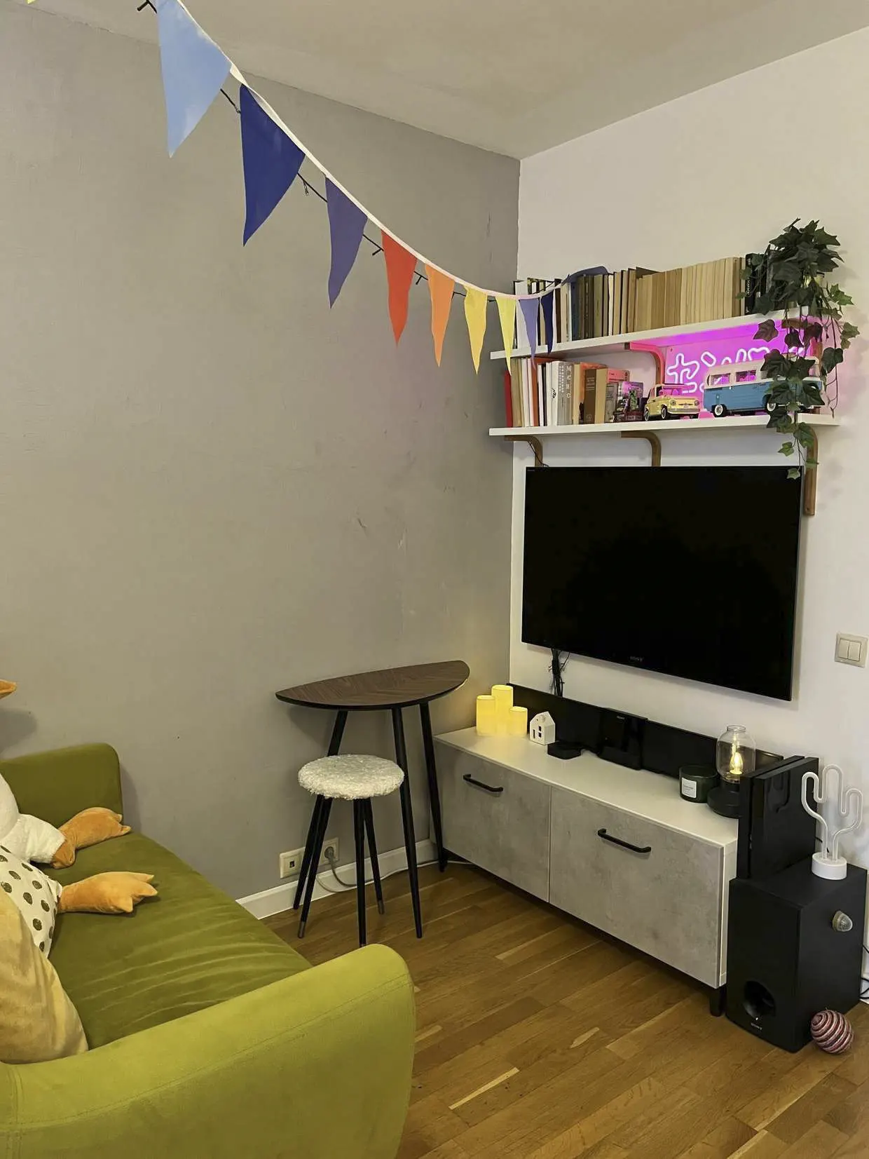 В итоге единственную комнату разделили ширмой на две зоны: получилась отдельная спальня и мини-гостиная для просмотра фильмов.