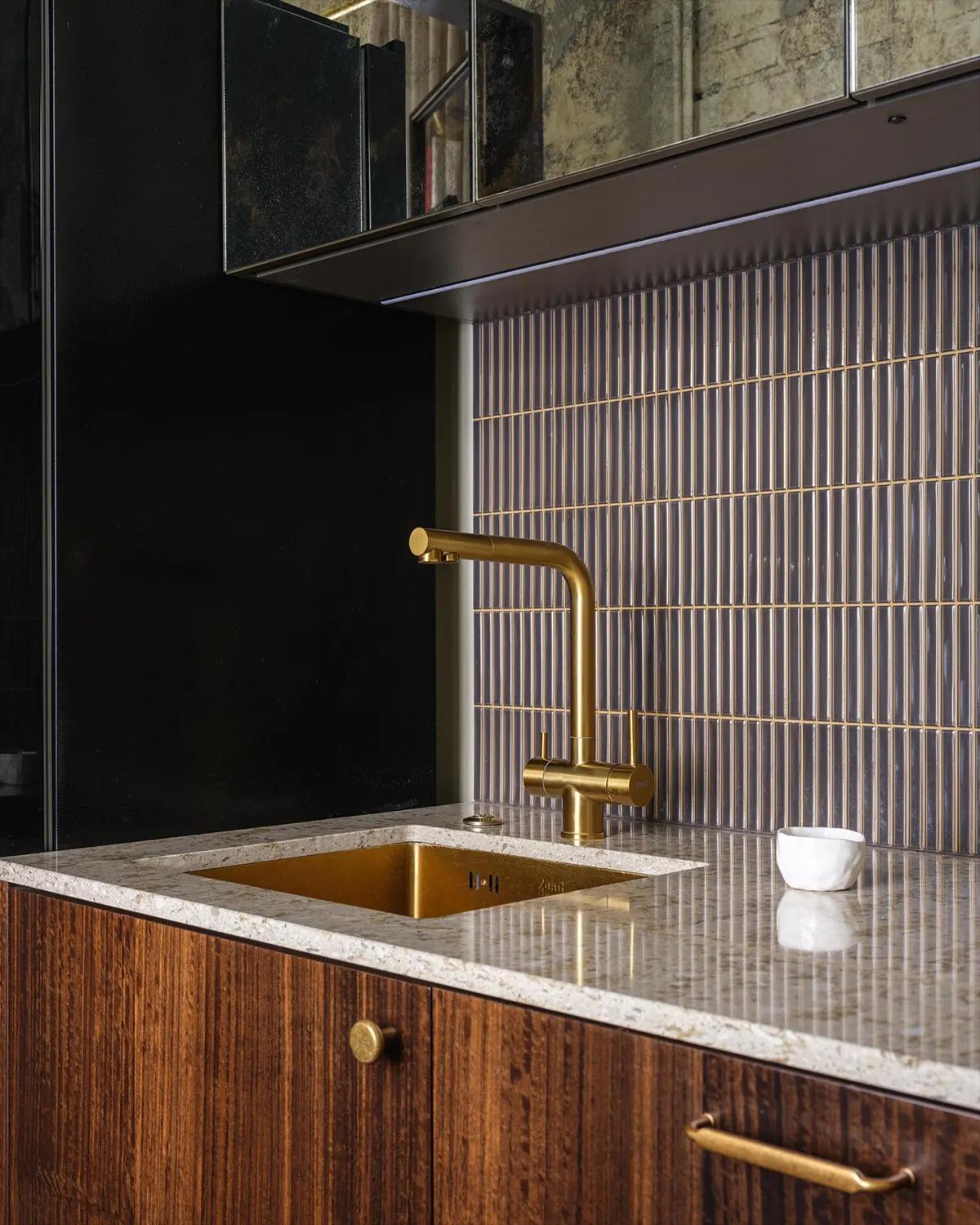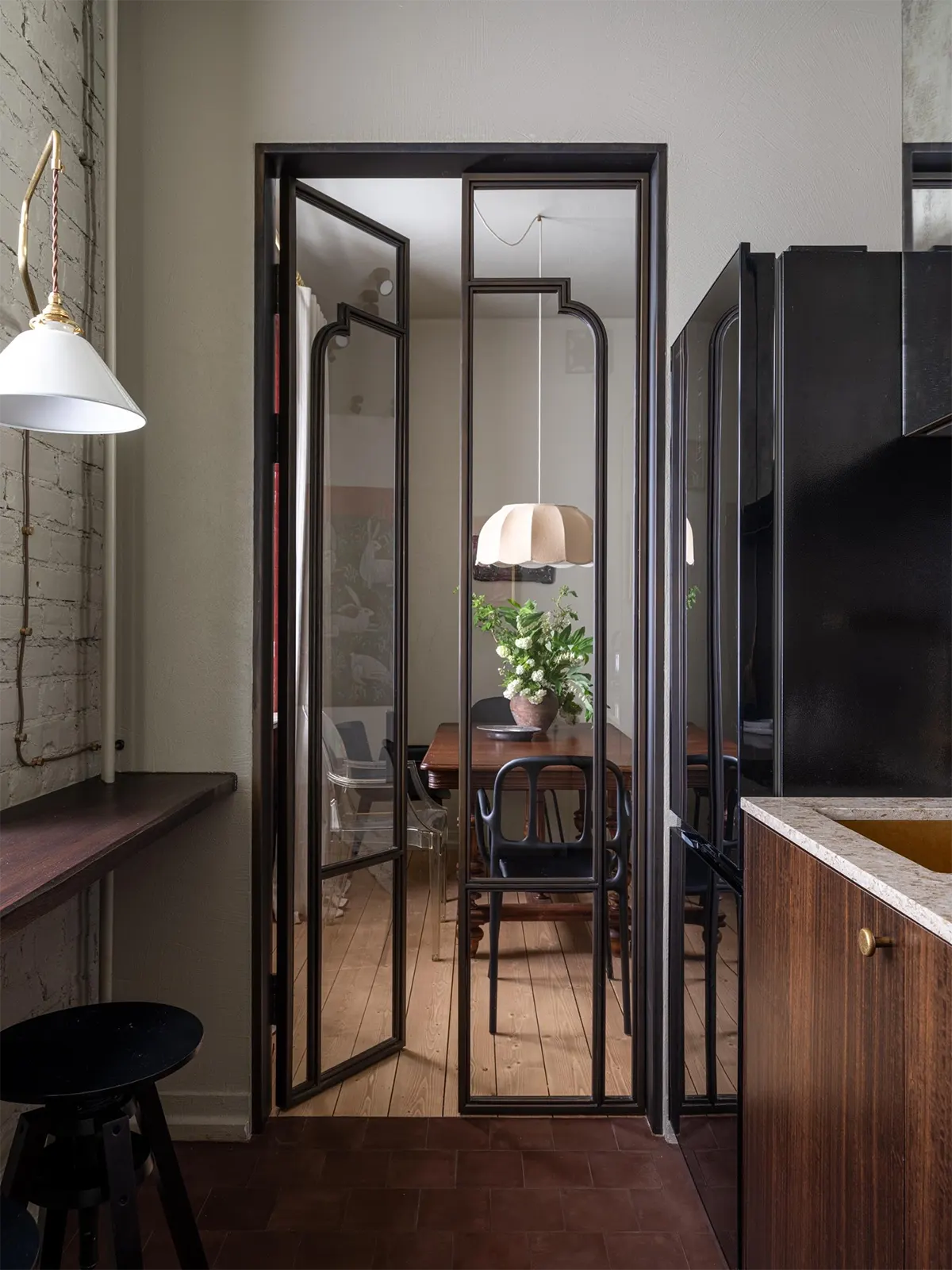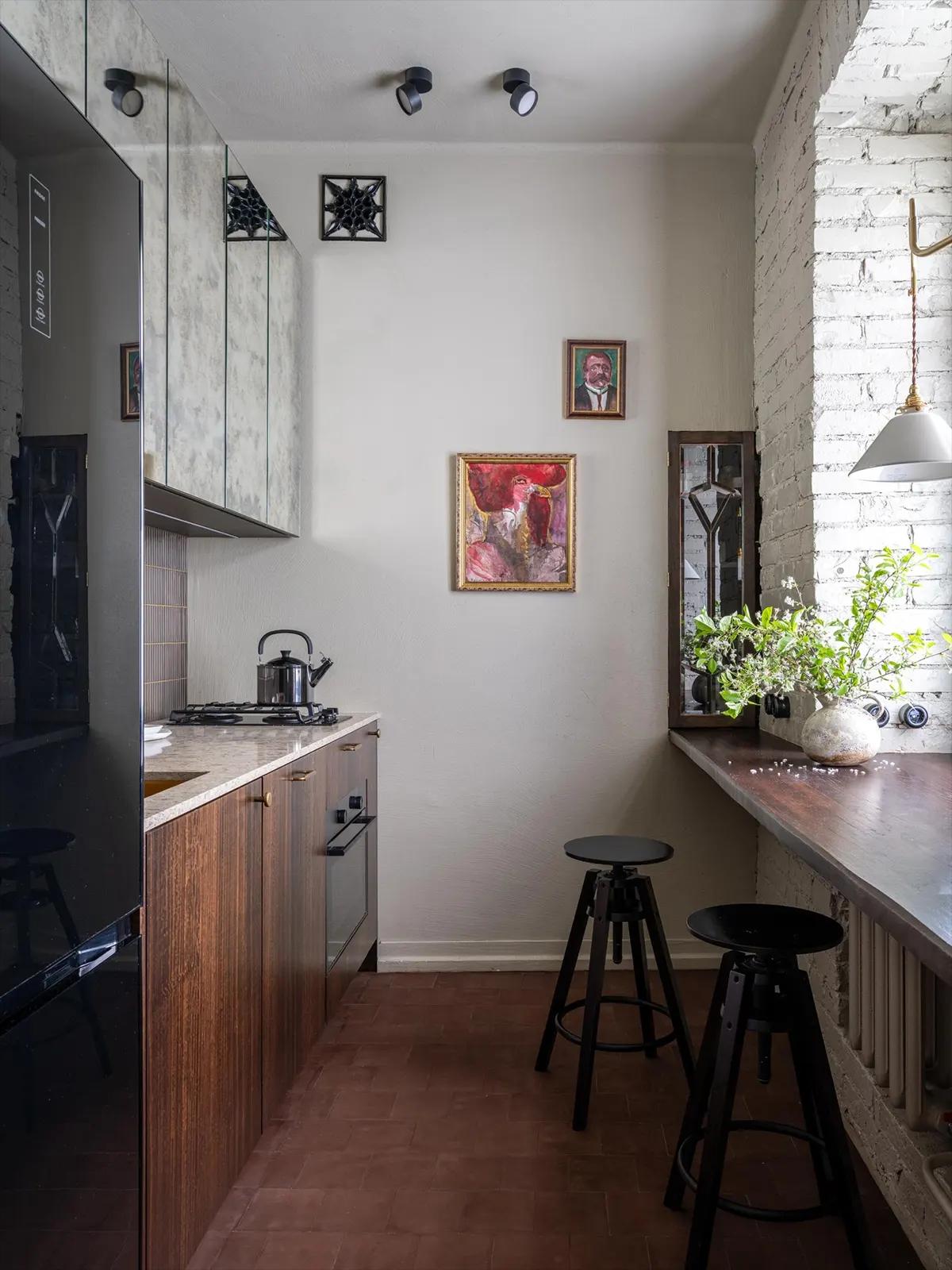 В интерьере этой квартиры много интересных предметов и нетипичных решений: стеклянные двери на кухне с покрытием под бронзу, тумба с бетонной раковиной в ванной, фасады шкафов — все разные, экспериментальные.