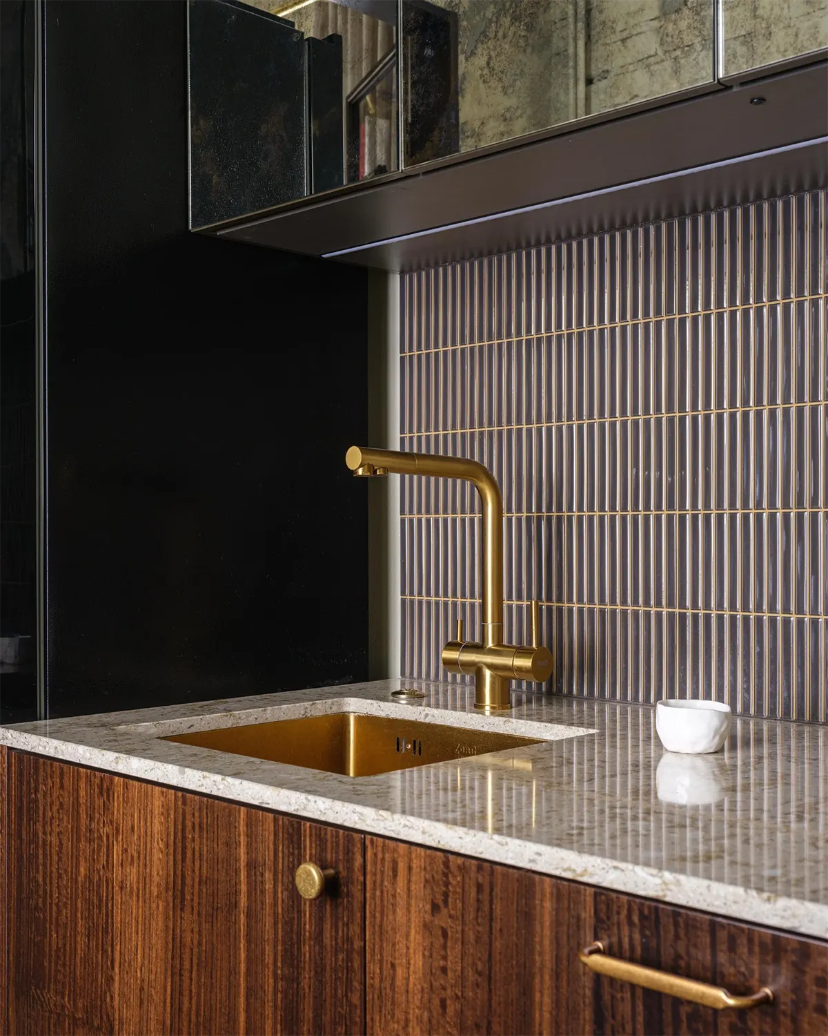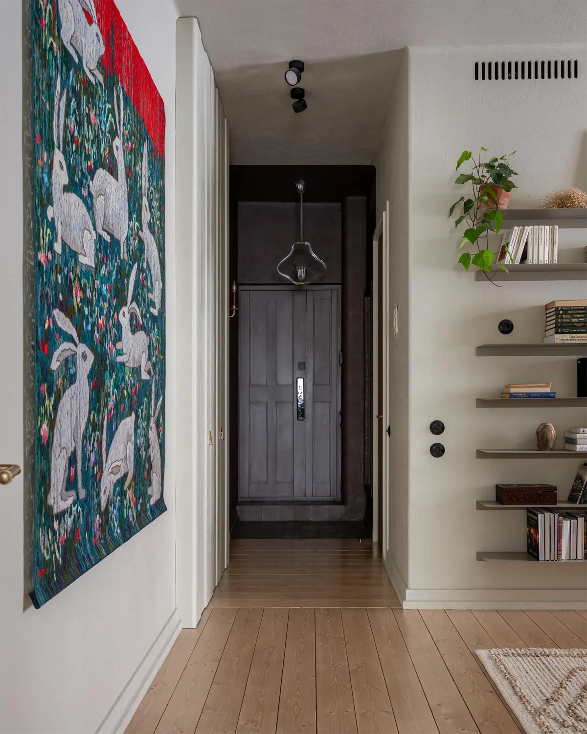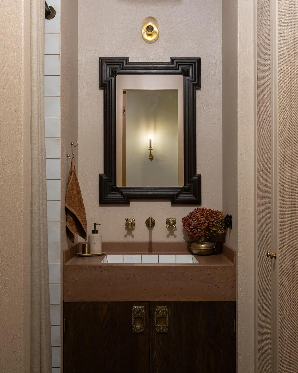 В интерьере этой квартиры много интересных предметов и нетипичных решений: стеклянные двери на кухне с покрытием под бронзу, тумба с бетонной раковиной в ванной, фасады шкафов — все разные, экспериментальные.