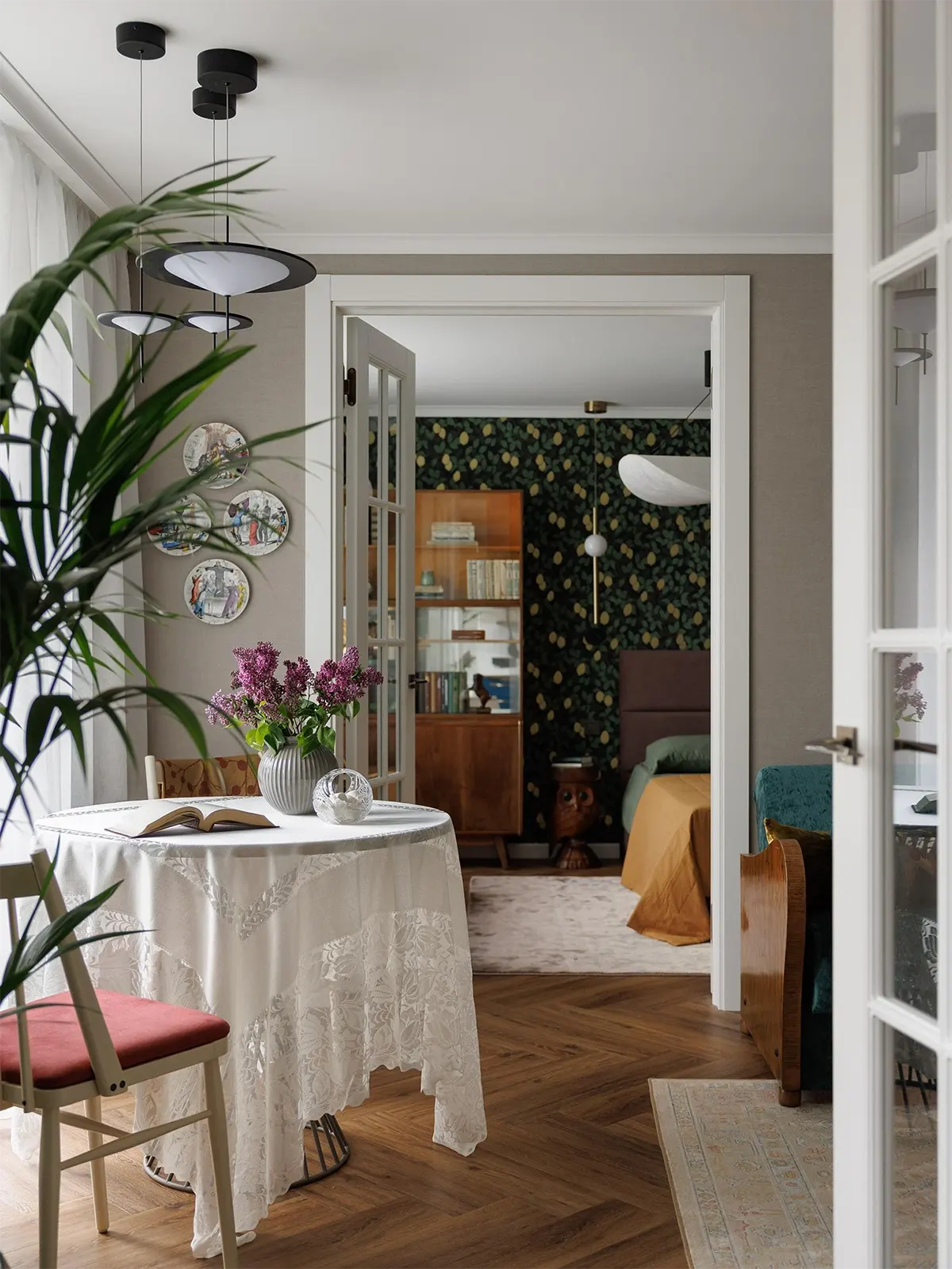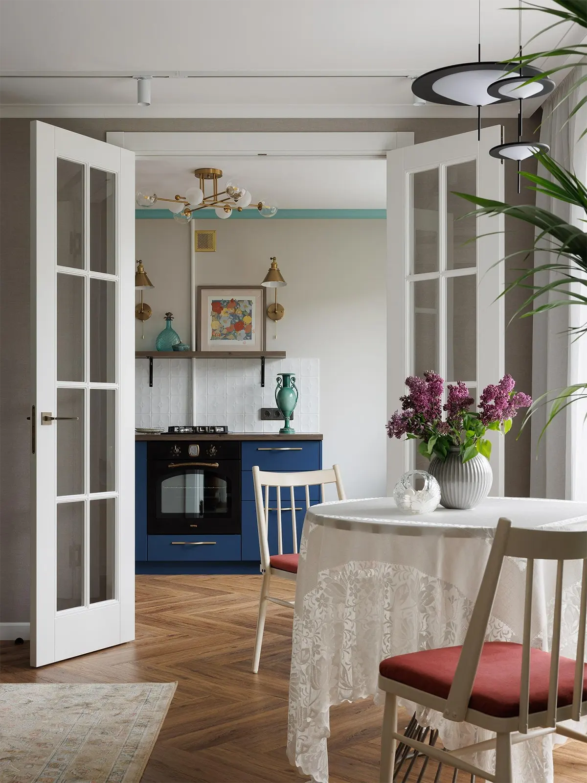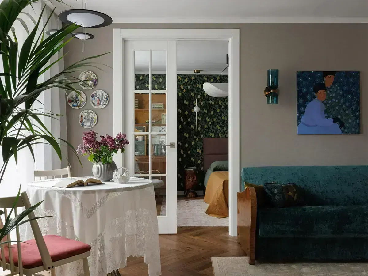 Раньше на этом месте была стена. Двухстворчатые двери объединили два пространства — кухню и гостиную, но при этом оба помещения остались изолированными.