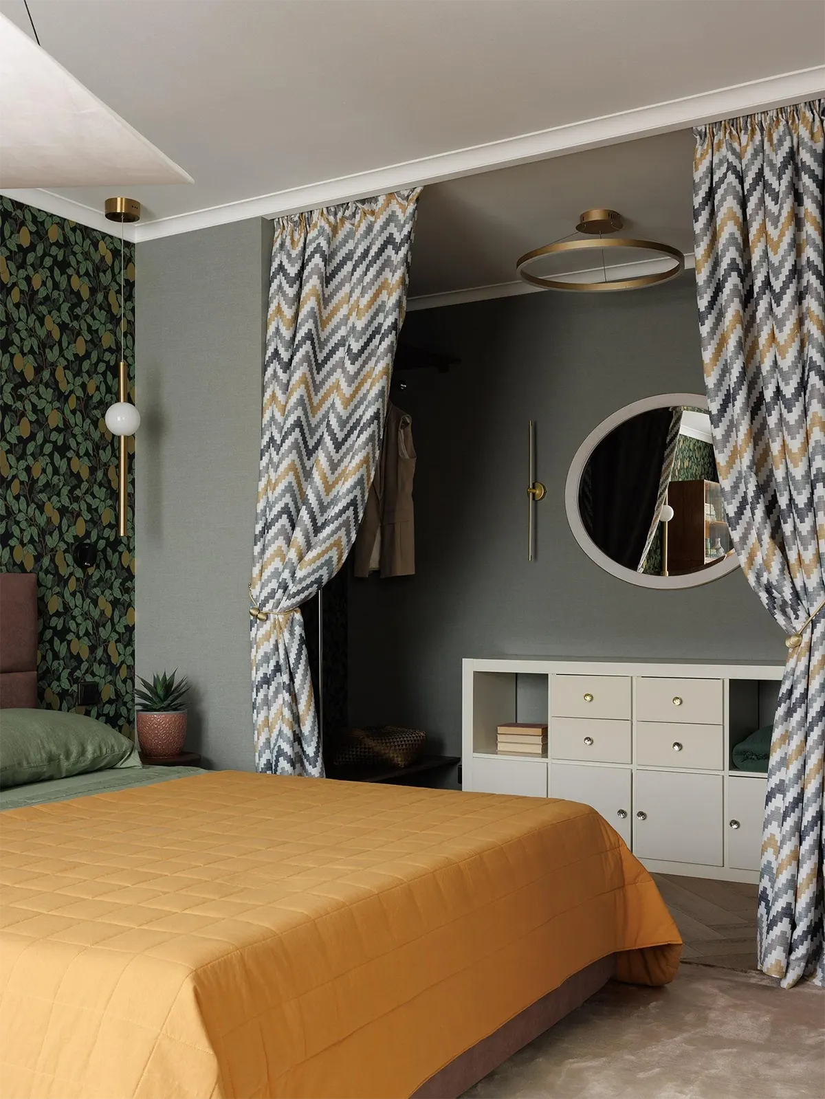 Спальню также коснулась небольшая перепланировка. Здесь выделили место под еще одну небольшую гардеробную. При желании эту нишу можно закрыть плотными шторами.