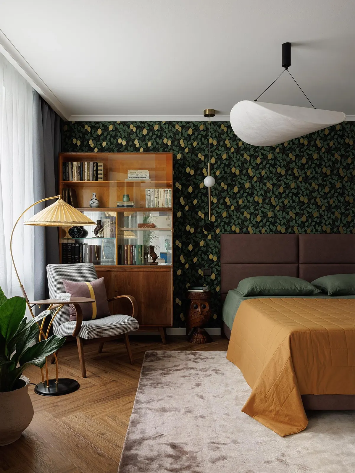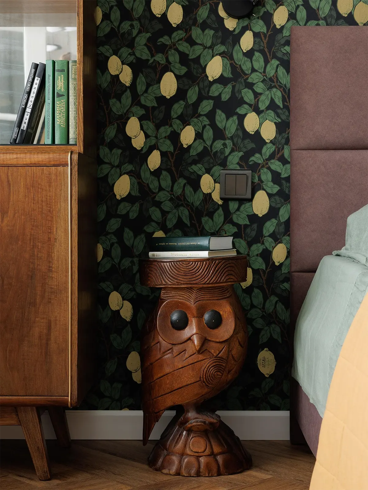 Яркие обои с лимонами от бренда Loymina. Прикроватный столик-сову привезли из путешествия в Индонезию.