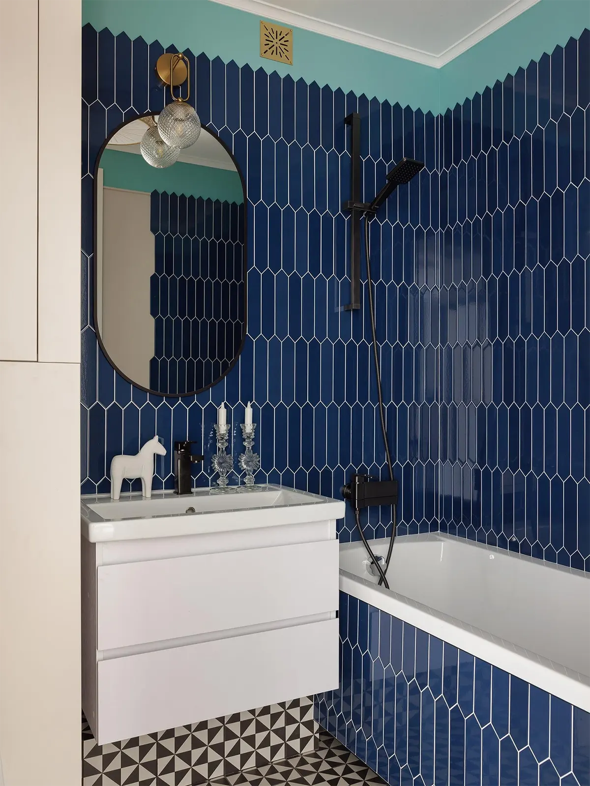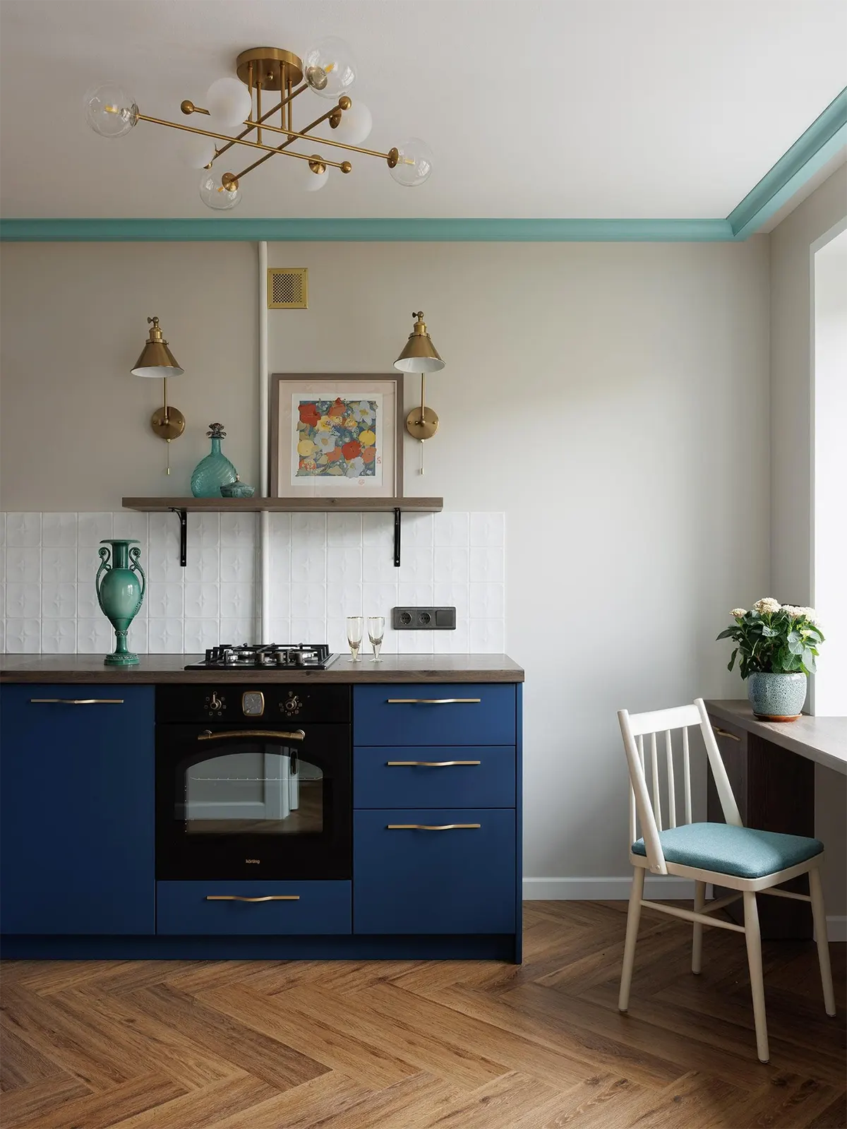 Синий кухонный гарнитур — самый яркий элемент во всей квартире. Поскольку владельцы планируют сдавать жильё в долгосрочную аренду, мебель для кухни выбрали бюджетную. Но благодаря темно-синим нижним фасадам и металлическим ручкам гарнитур смотрится изысканно.