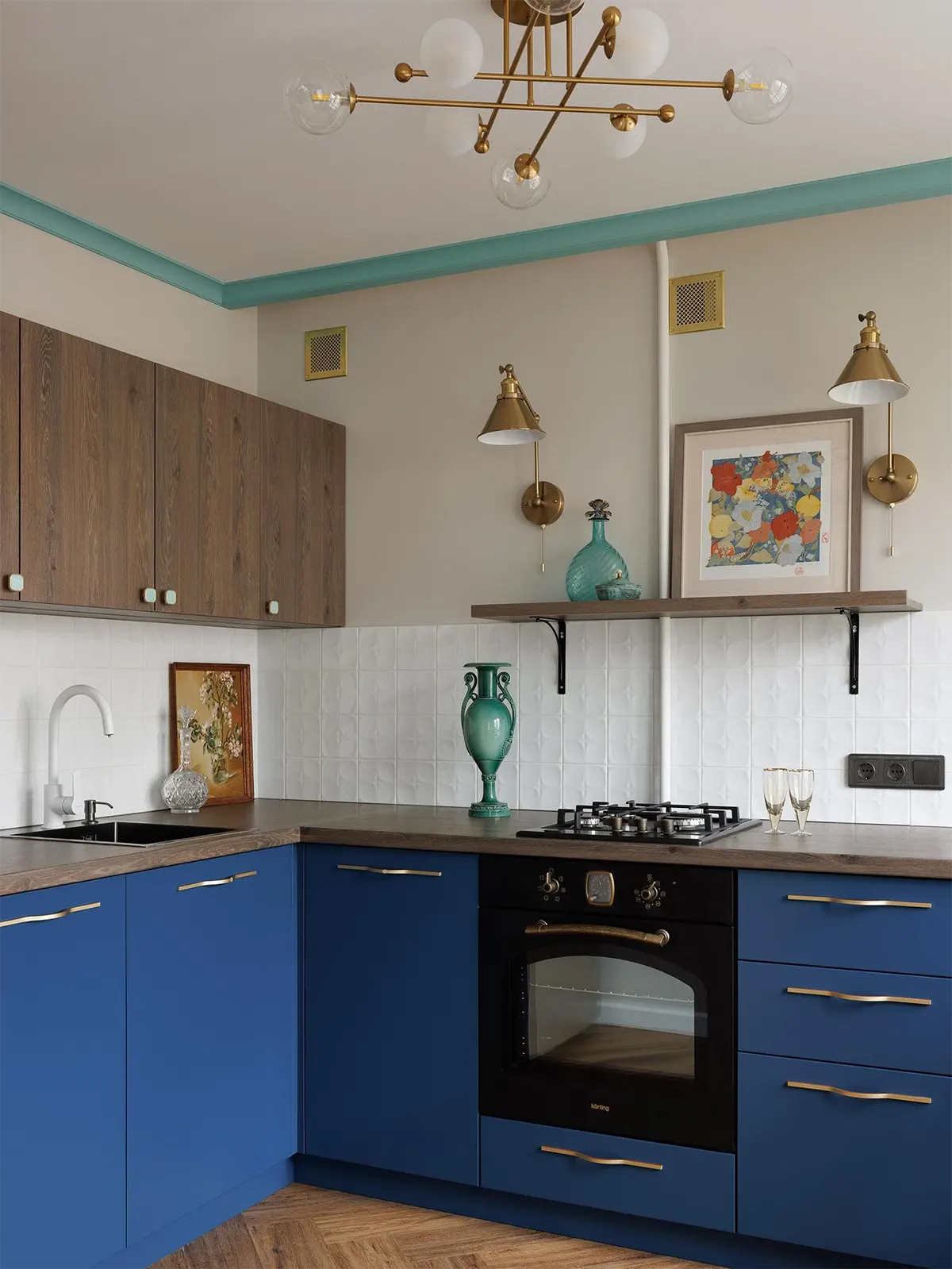 Духовку специально подобрали в ретро-стиле. Такую модель нашли у немецкого бренда Korting (на российском рынке он представлен с 2011 года). Стилизованный под старину фасад, латунная ручка и поворотные регуляторы действительно выглядят винтажно.