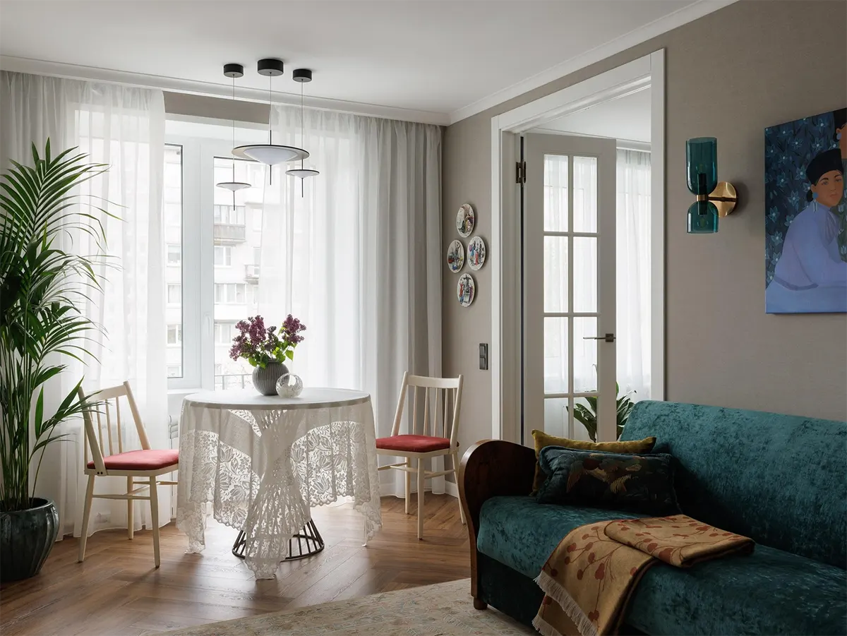 За разработкой перепланировки и созданием ретро-атмосферы владельцы обратились к дизайнеру Александре Якушенко.