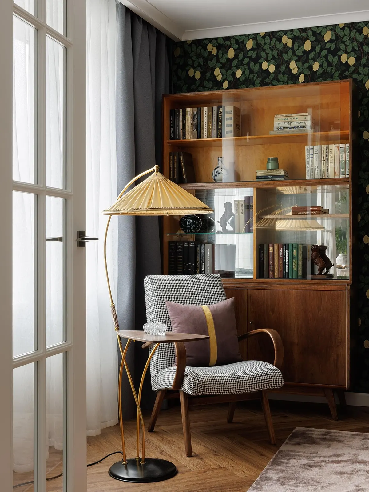 Владельцы квартиры сохранили часть мебели, оставшейся от родственников. Здесь можно увидеть старый комод, книжные шкафы, стулья, кресло, диван, торшер и даже знакомый многим чешский гарнитур. После реставрации эти вещи гармонично вписались в обновленный интерьер.