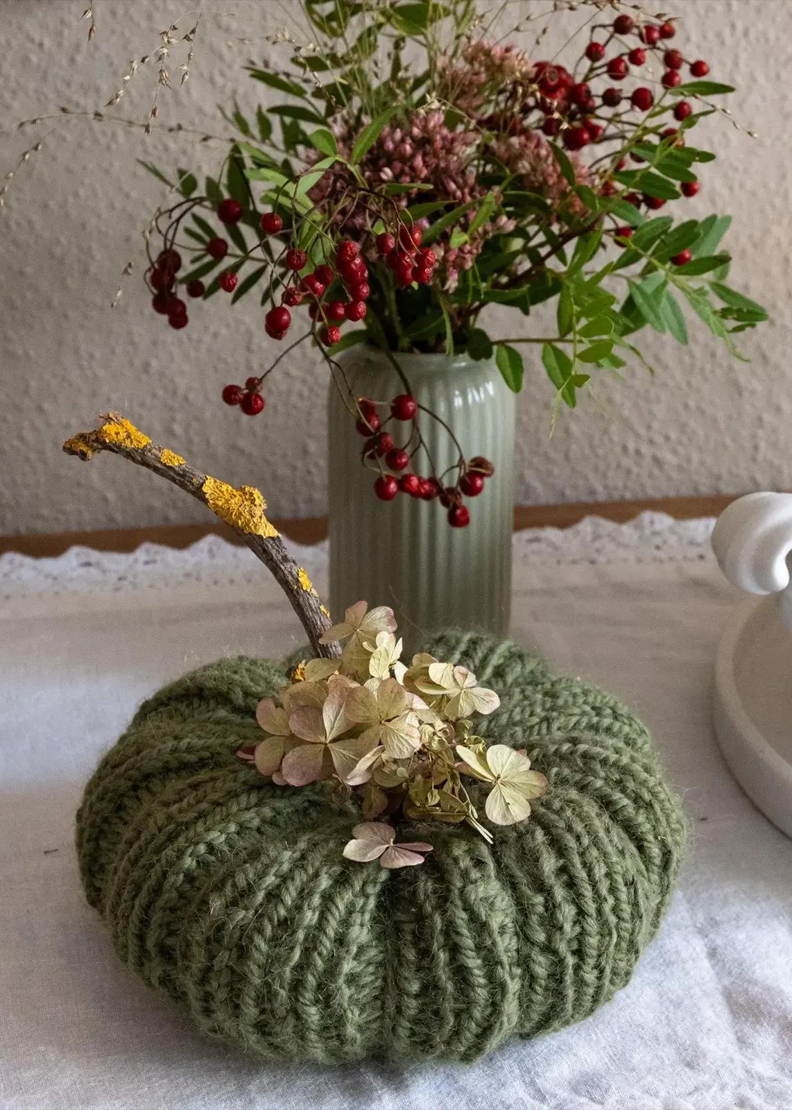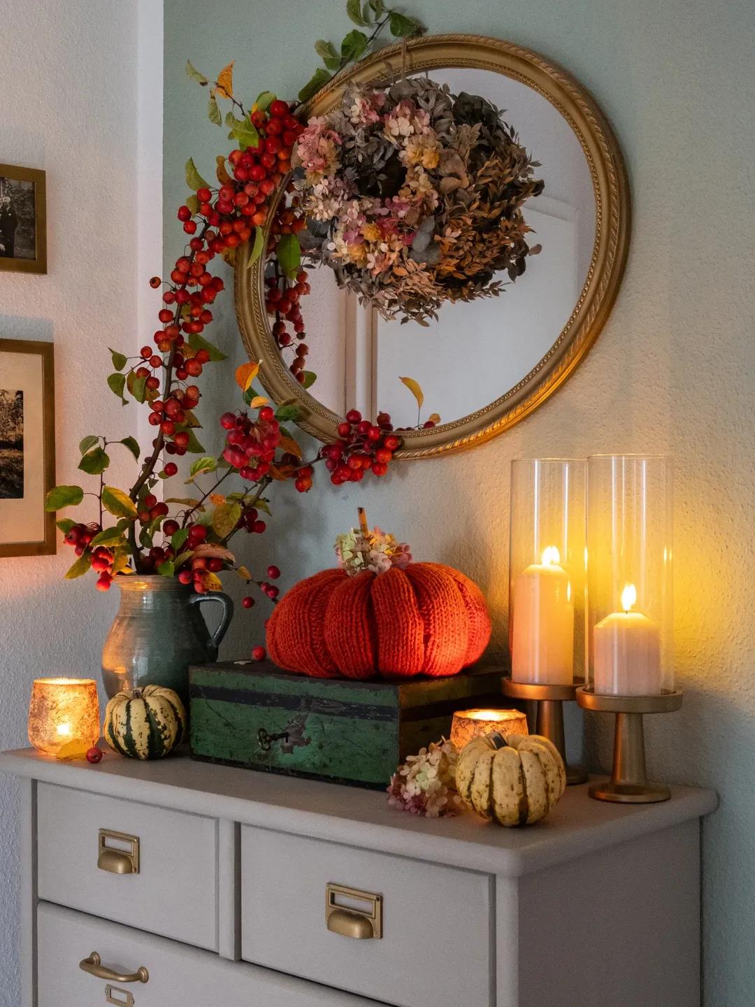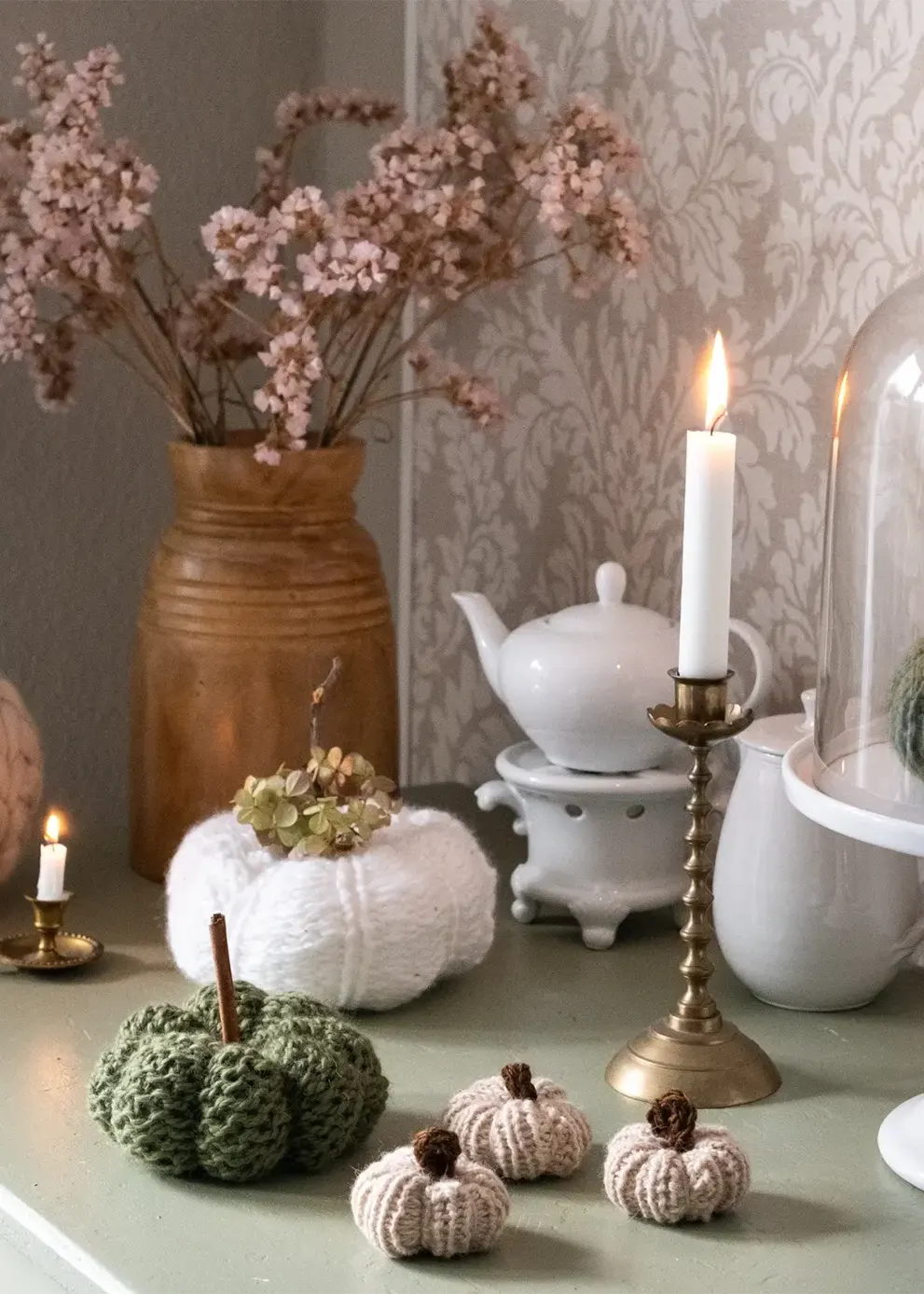Приглушенные оттенки зеленого и оранжевого — идеальная цветовая гамма для осеннего интерьера. А декоративные тыквы, выращенные в собственном саду, стали частью ноябрьского декора. Хозяйка нашли им необычное применение: теперь это вазы для сухоцветов.