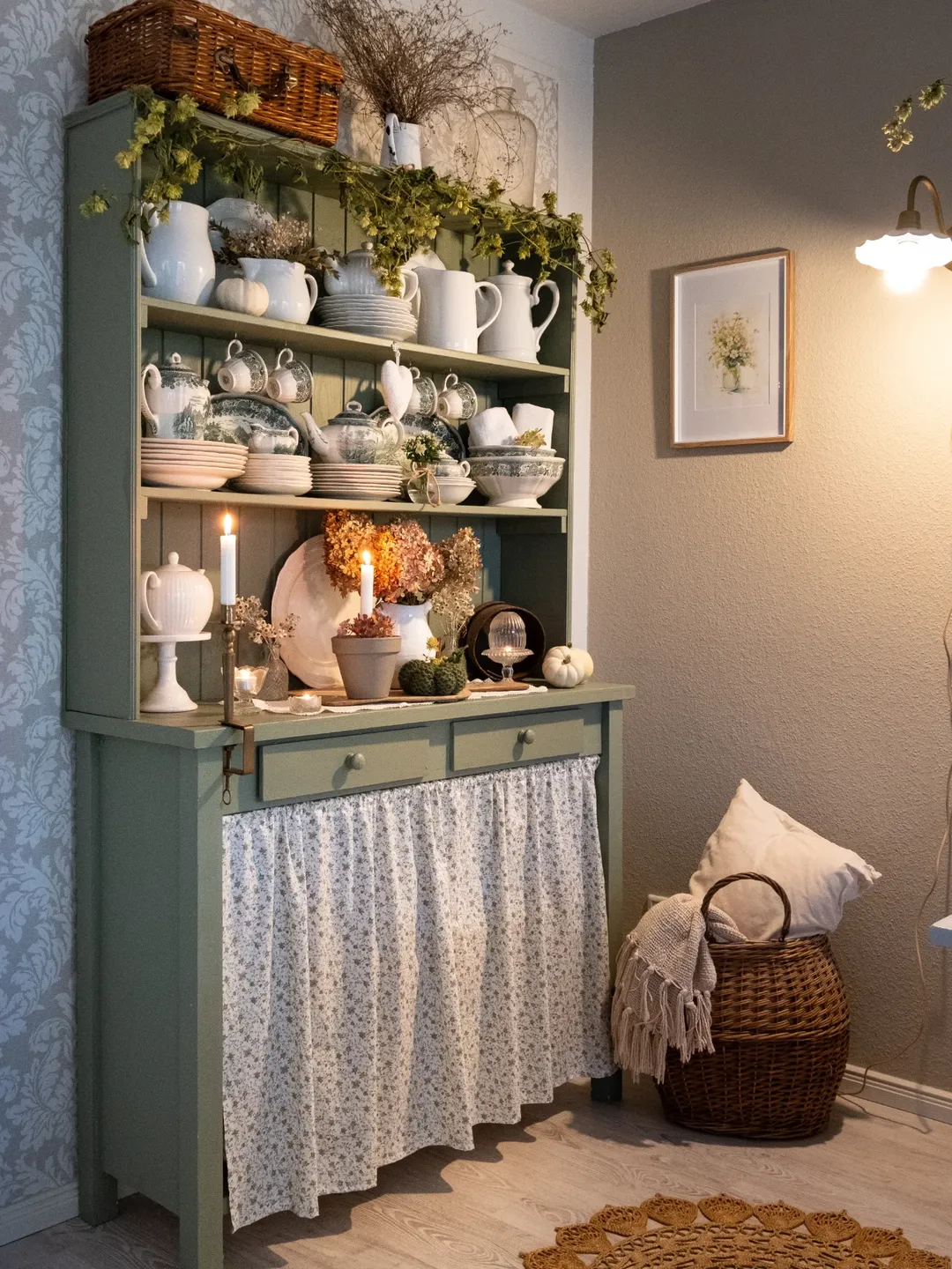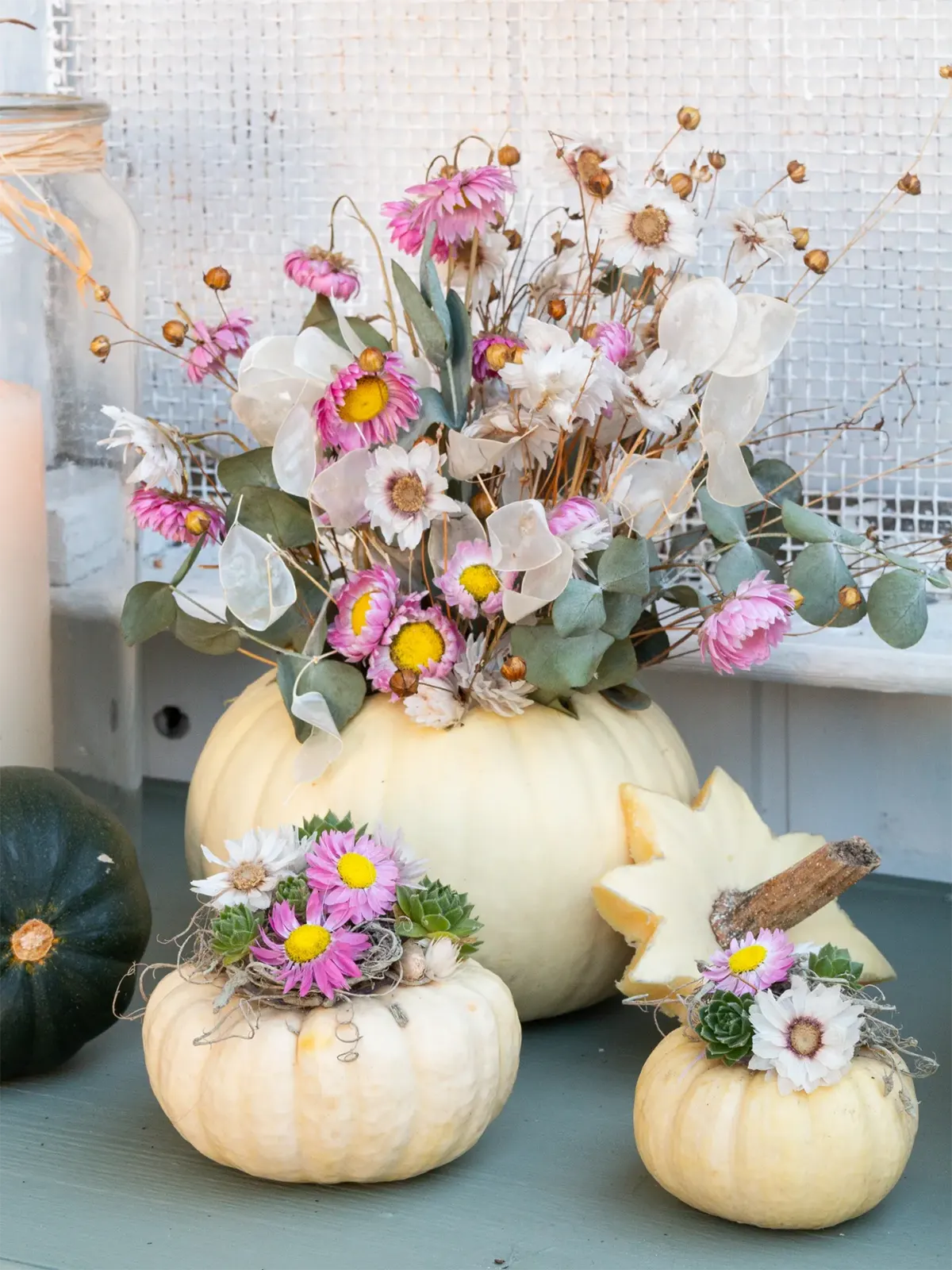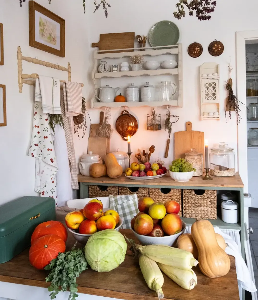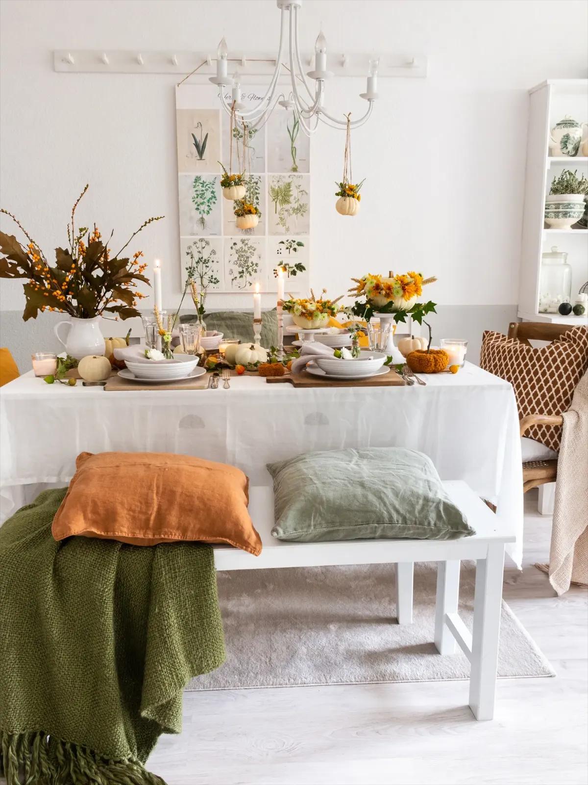 Приглушенные оттенки зеленого и оранжевого — идеальная цветовая гамма для осеннего интерьера. А декоративные тыквы, выращенные в собственном саду, стали частью ноябрьского декора. Хозяйка нашли им необычное применение: теперь это вазы для сухоцветов.