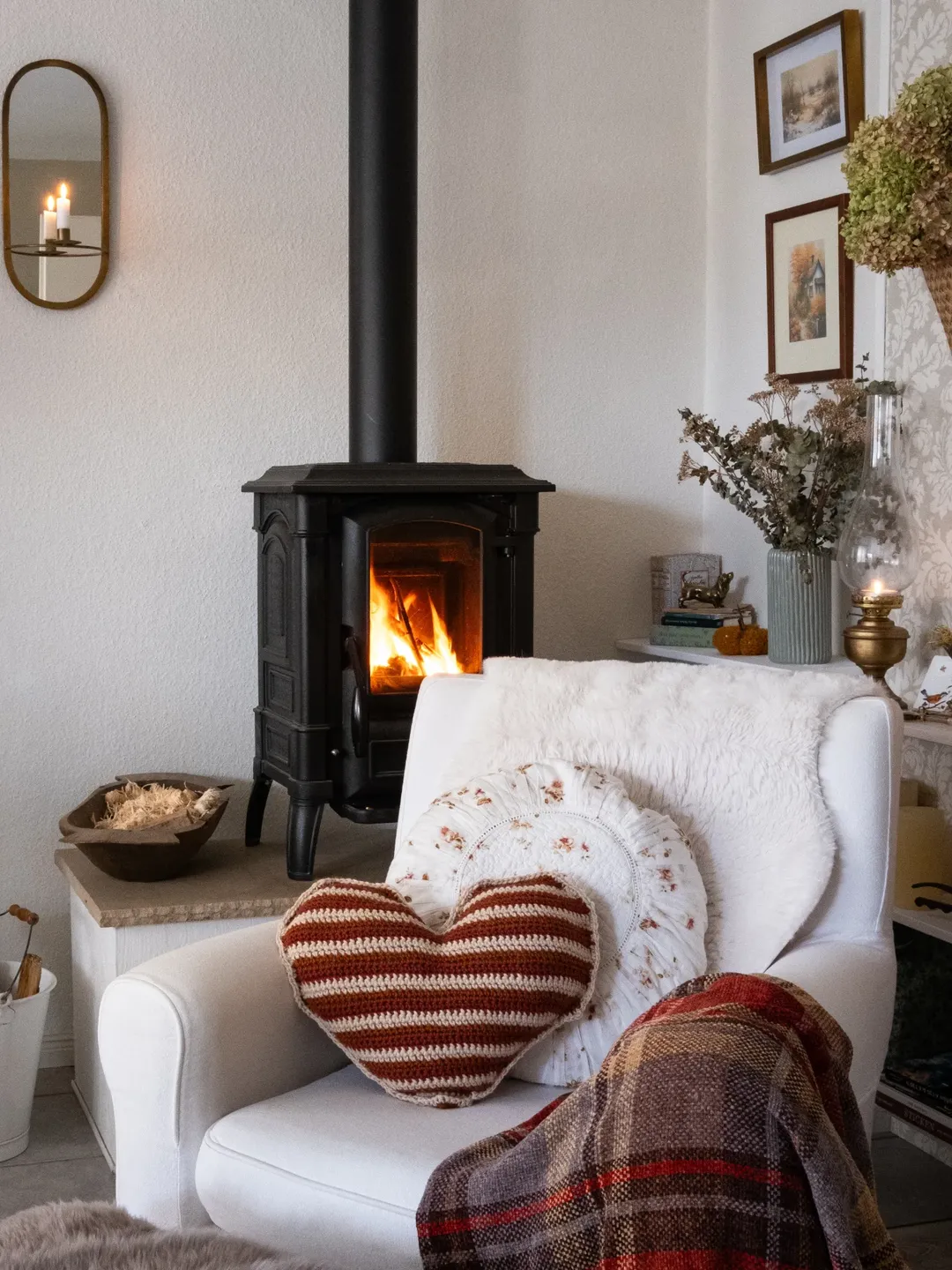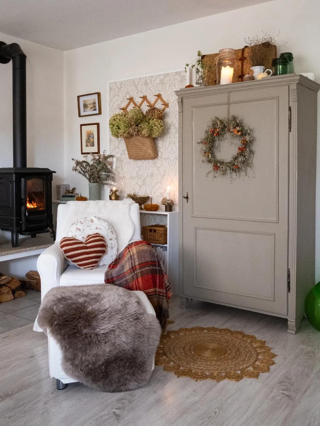 Так, например, уютная подушка в форме сердца на кресле у печки связана из остатков пряжи ржаво-коричневого цвета — оттенка осенних листьев. Эта небольшая деталь гармонично вписалась в интерьер старого немецкого домика, добавив в него мягкости и тёплого настроения.