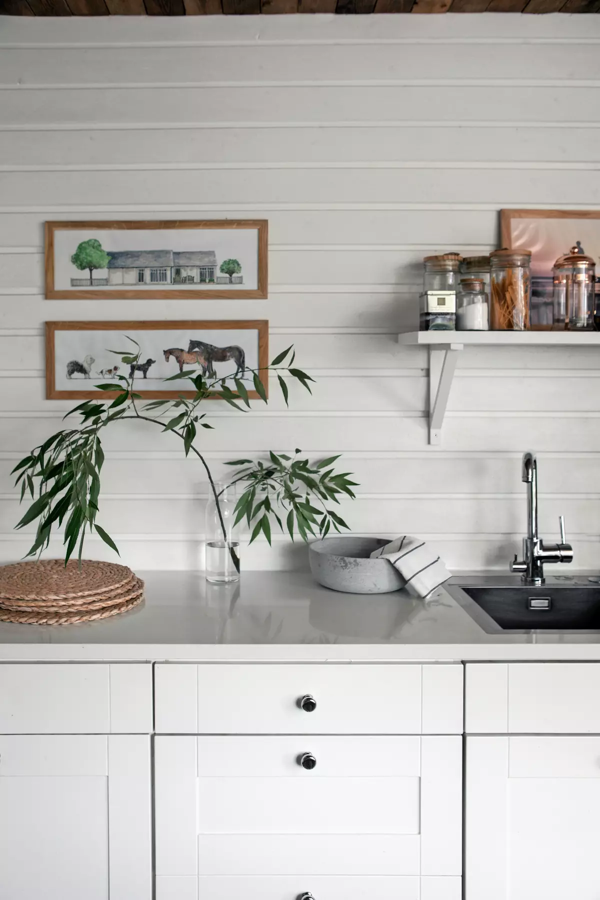 Кирси не хотела, чтобы кухня выглядела грязной и безвкусной. Светлые оттенки, простые открытые полки и незамысловатый декор создают непринужденную атмосферу.