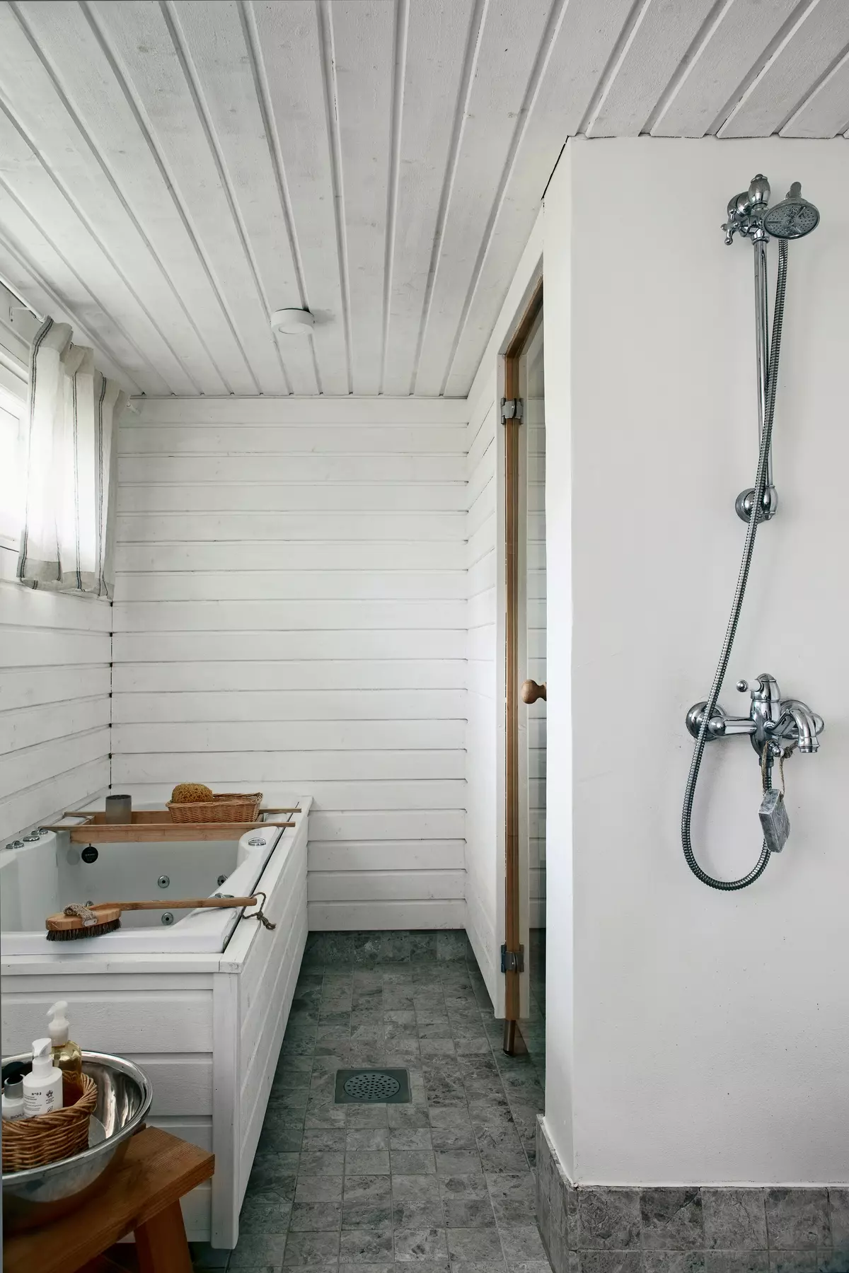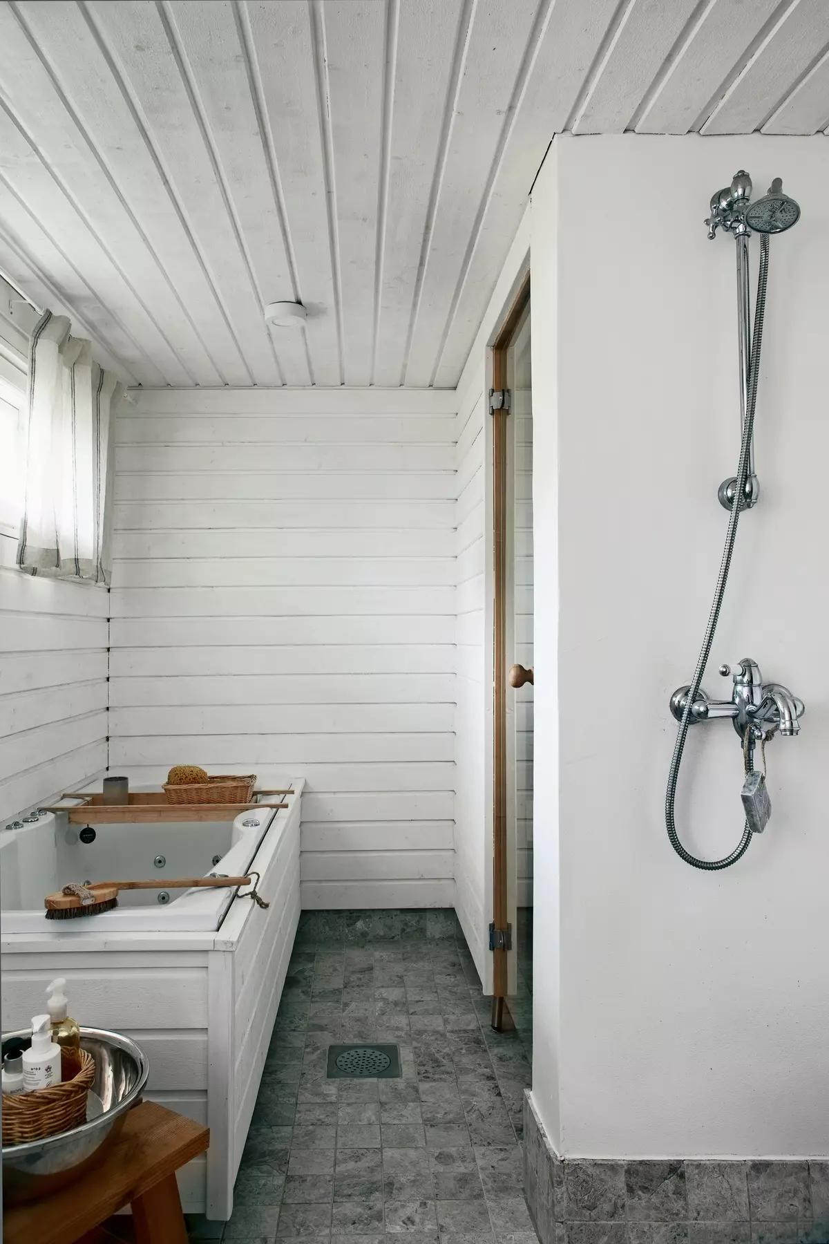 Ванная комната, как и традиционная финская сауна, обустроены в подвальном помещении. Здесь есть гидромассажная ванна и отдельный душ. Для комфорта сделаны теплые полы.