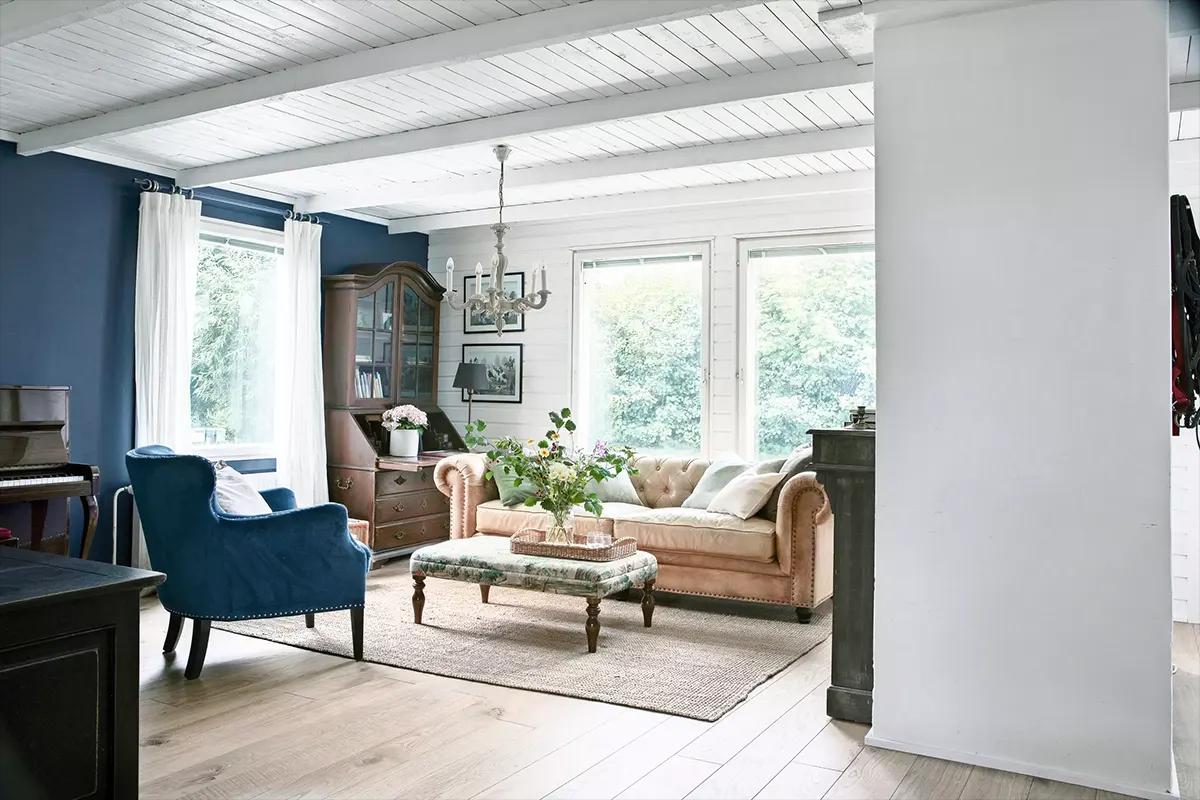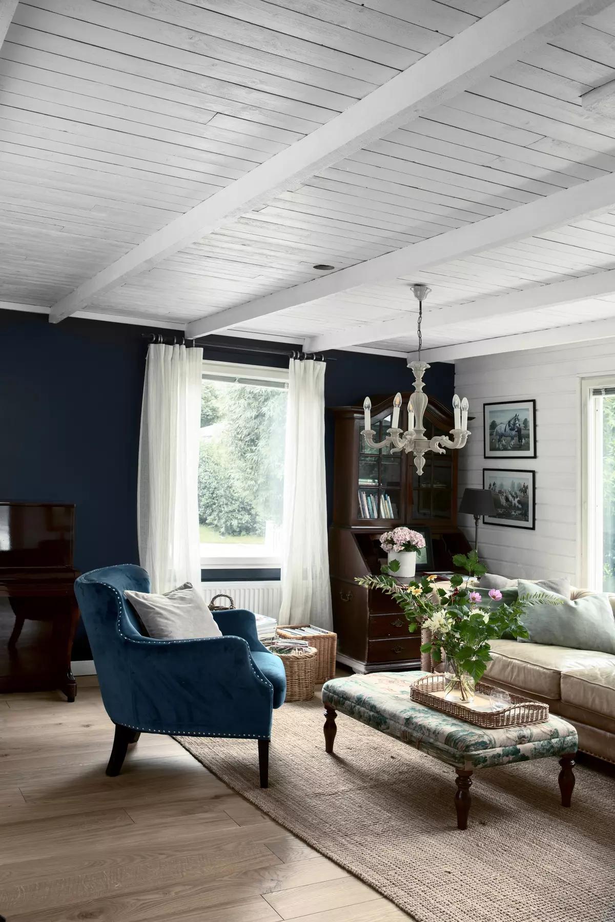 В гостиной Кирси сделала акцентную синюю стену. И подчеркнула оттенок морской волны винтажным креслом.