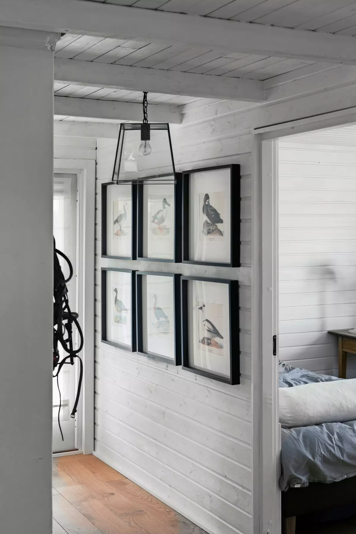 Безликую стену в коридоре украсили репродукции с птицами. Кирси вырезала эти картинки из старых журналов.