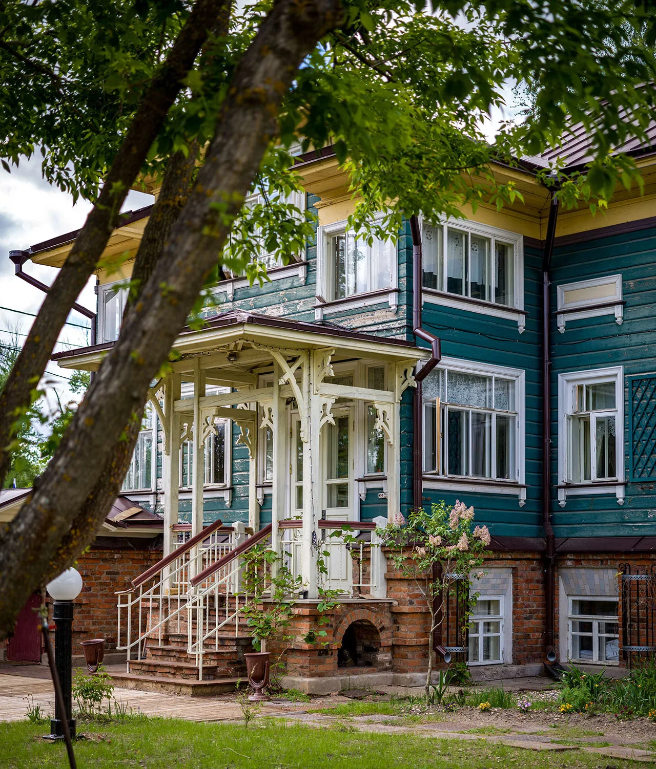 Вид на старый купеческий дом со стороны внутреннего дворика. Новые владельцы позаботились не только о состоянии деревянного особняка, но и привели в порядок запущенный сад. Теперь это красивая и ухоженная территория — с беседками, приватными зонами для отдыха, раскидистыми деревьями и кустарниками.
