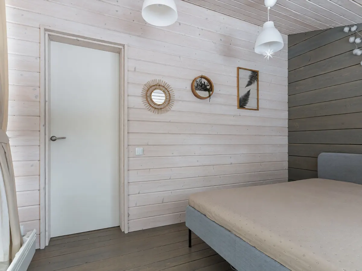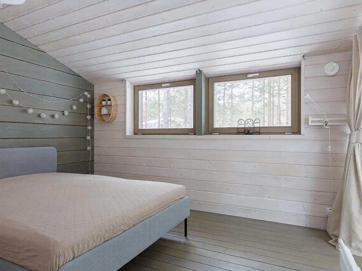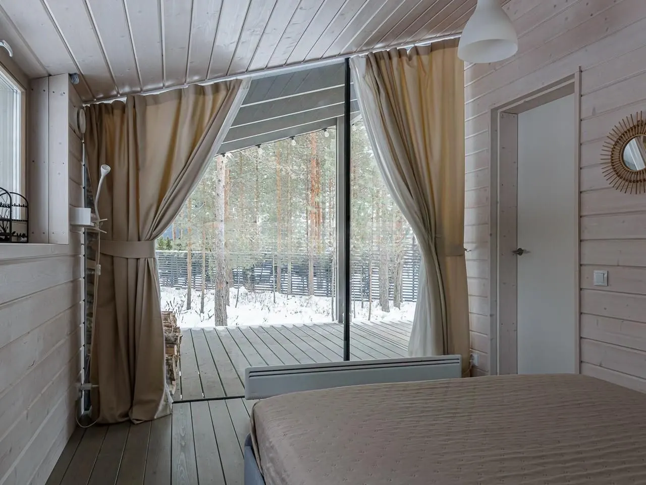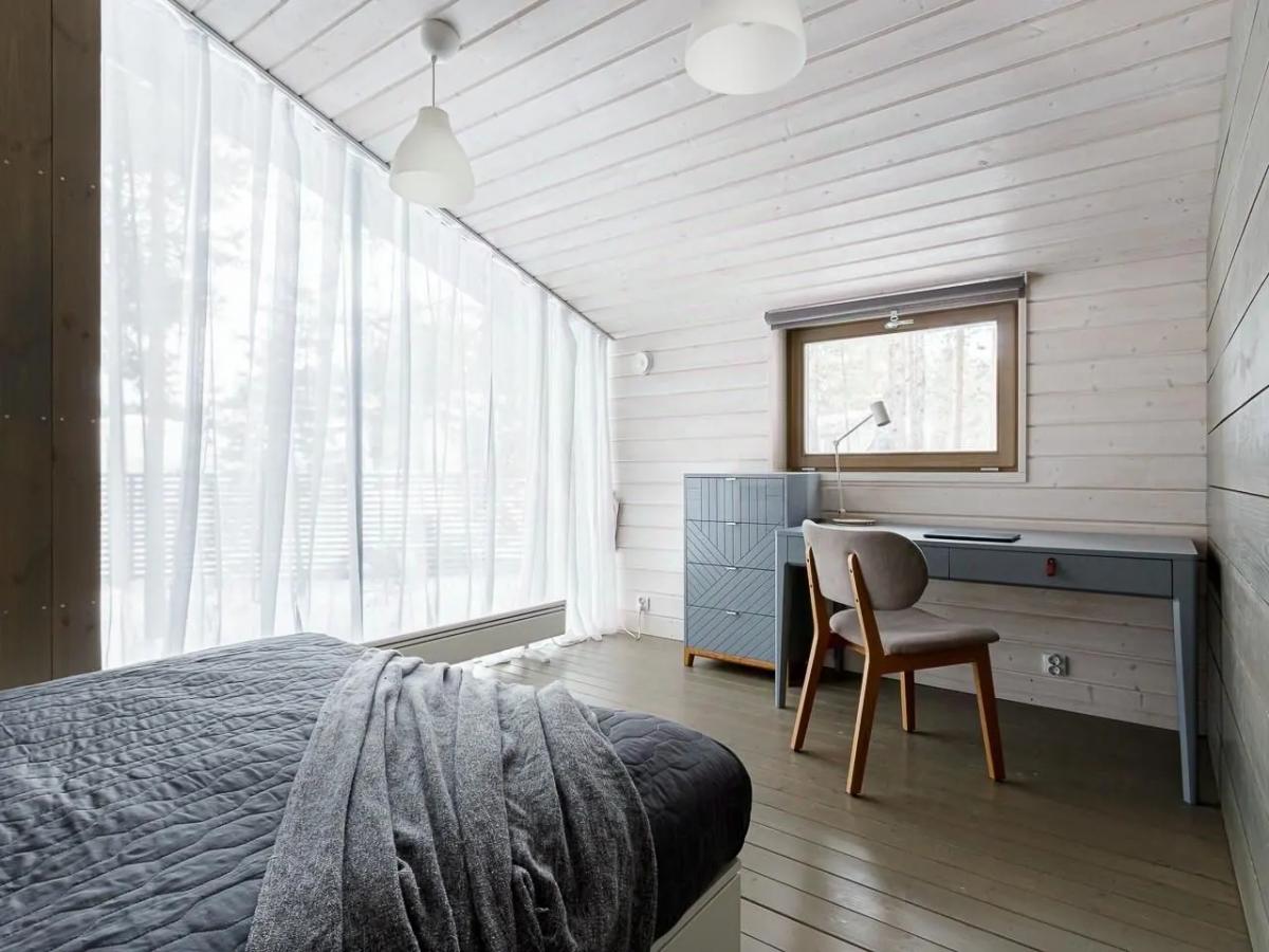 В доме есть две спальни. В каждой — окна в пол с видом на внутренний двор и сосновый бор.