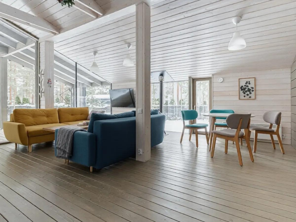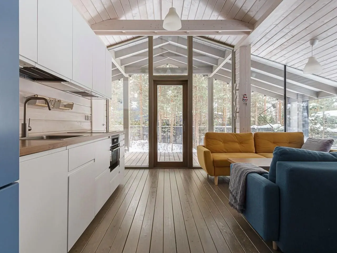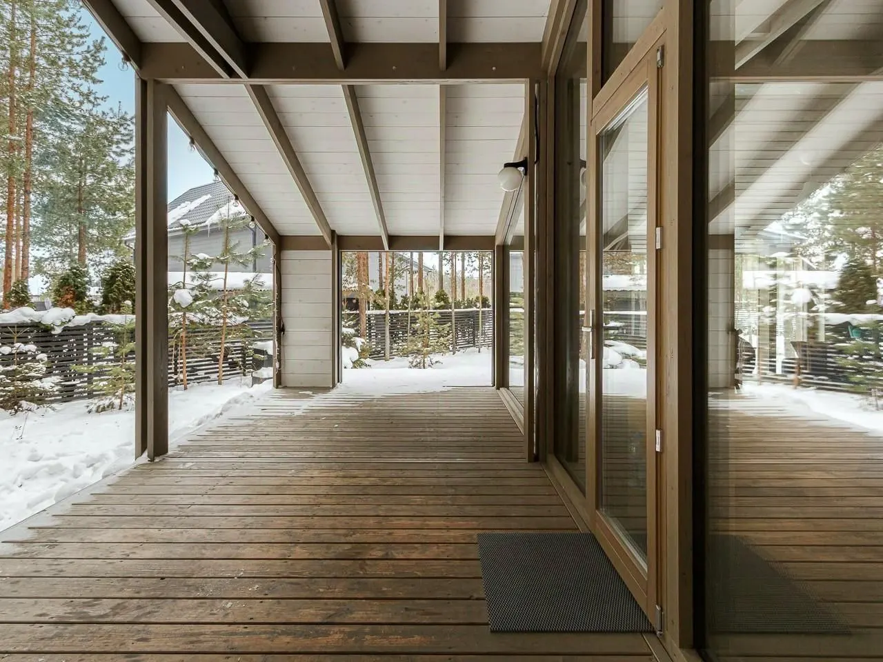 Вместе с домом идет участок площадью 11 соток. В саду сохранены многолетние сосны и естественный лесной покров, растет вереск и черника. Поэтому здесь создается ощущение, что ты живешь прямо посреди леса.
