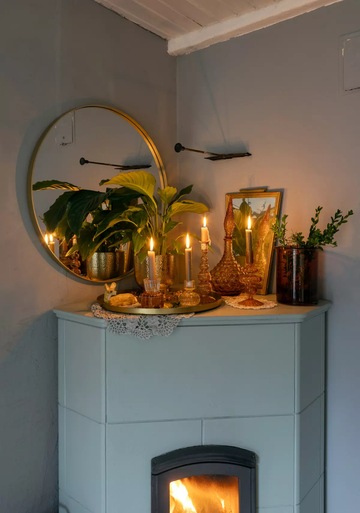 Над камином можно увидеть композицию из свечей и зеркал. Здесь же стоит глиняная фигурка Бемби, которую Меку сделала в детстве.