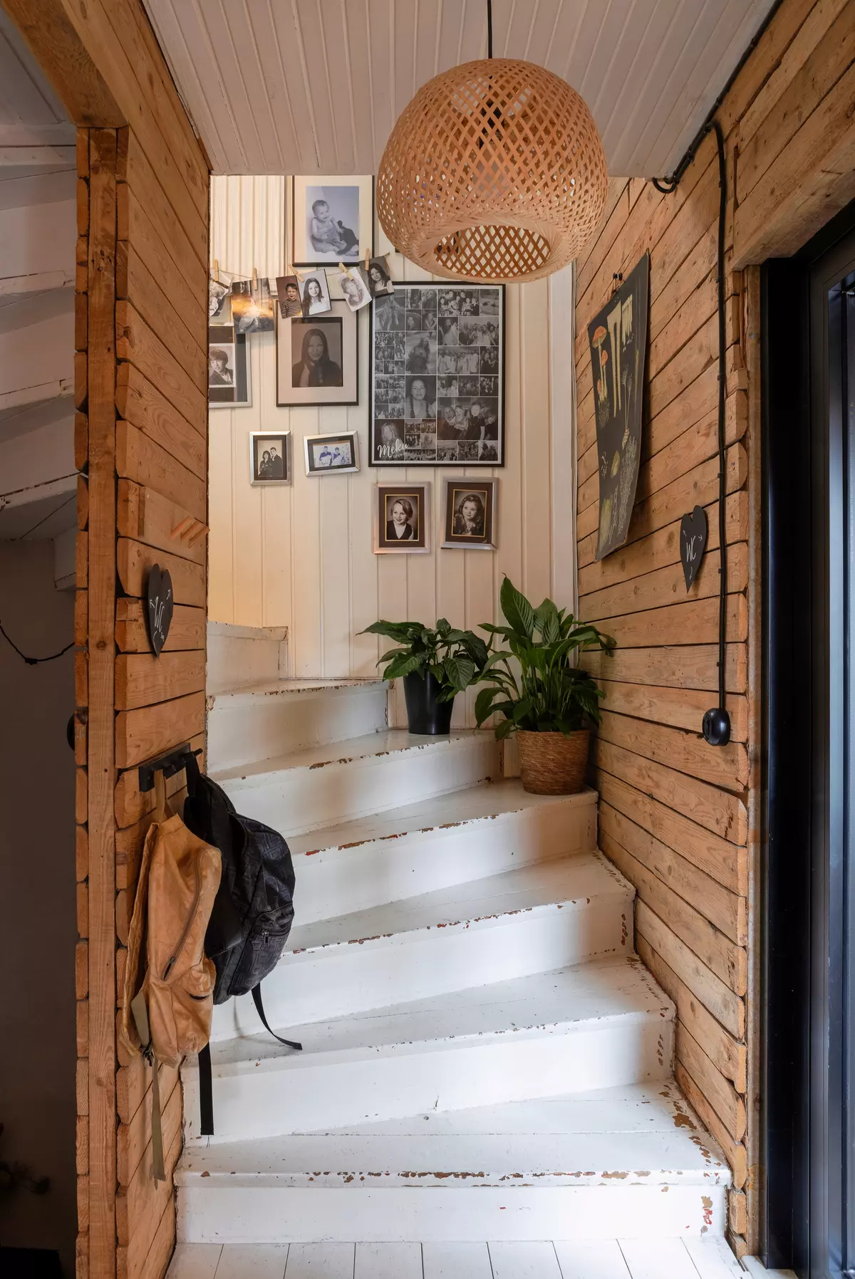 Вдоль лестницы сделали фотостену со старыми семейными фотографиями. Тут же Меку прикрепила стикеры в форме сердец, которые указывают гостям путь в гостевые санузлы.