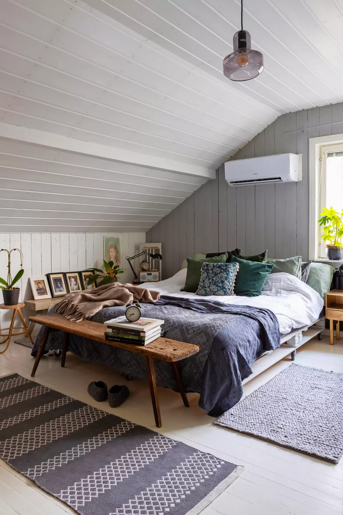 Так выглядит спальня хозяйки. Кровать сделана из дешевых деревянных поддонов. Старая скамейка, которая служит подставкой под вещи и одежду, досталась бесплатно от соседей.