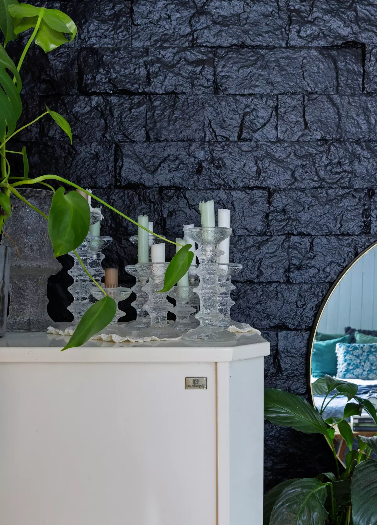 На каминной полке стоит коллекция стеклянных подсвечников, которые Меку собирала вся жизнь. Некоторые из них — из деревенского дома, где она выросла. Некоторые достались от покойной подруги. А еще несколько были куплены в старинном поместье, где Меку когда-то побывала на экскурсии.
