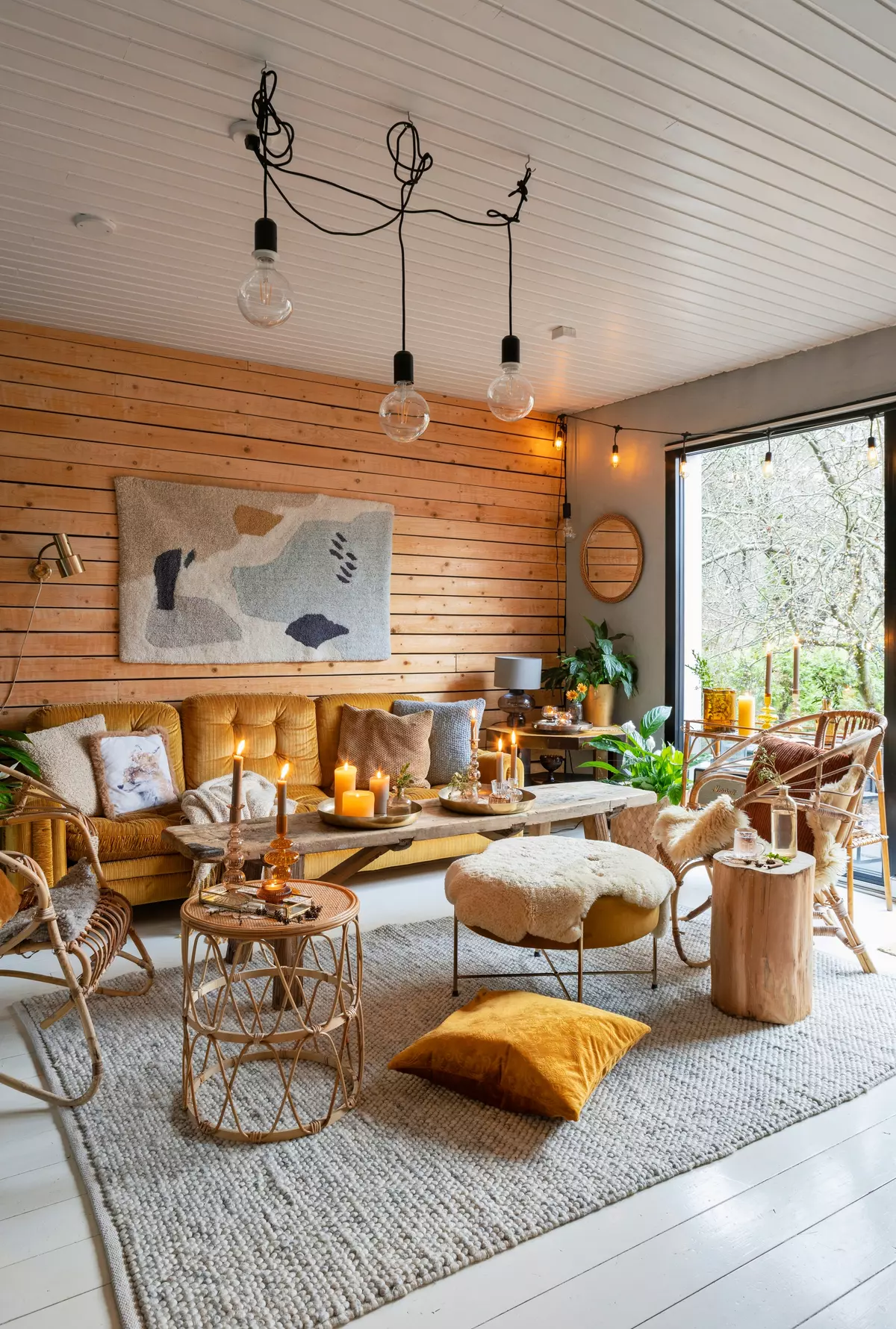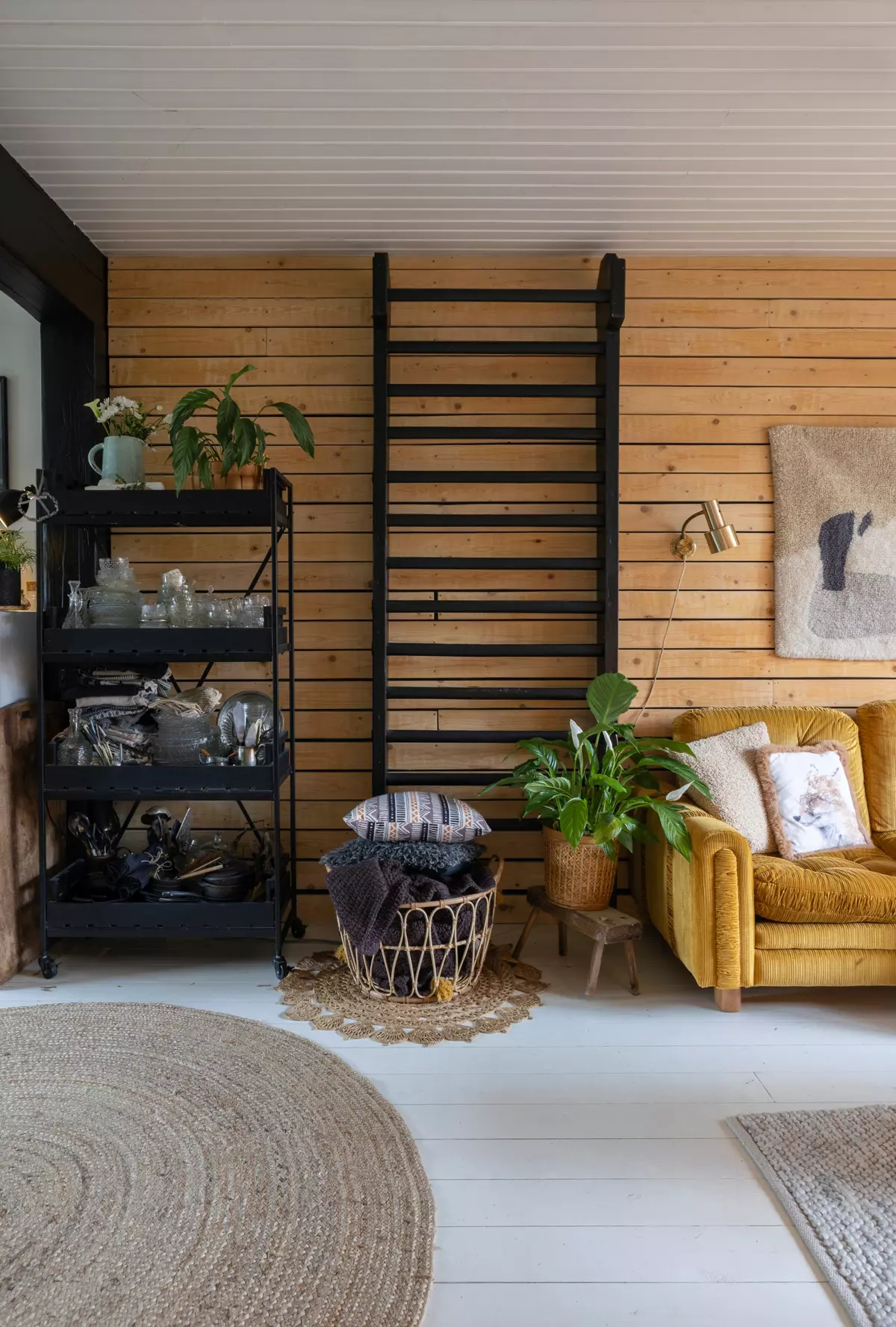 Здесь почти нет новых вещей. Например, вельветовый диван достался семье бесплатно: его забрали у соседей, которые переезжали в другой район и раздавали свои вещи. Компанию желтому дивану составляет разномастный комплект деревянной мебели: здесь и плетеные кресла из ротанга, и старая скамейка из сада, и бревно в роли кофейного столика. И лишь ковер на стене — от H&M Home.