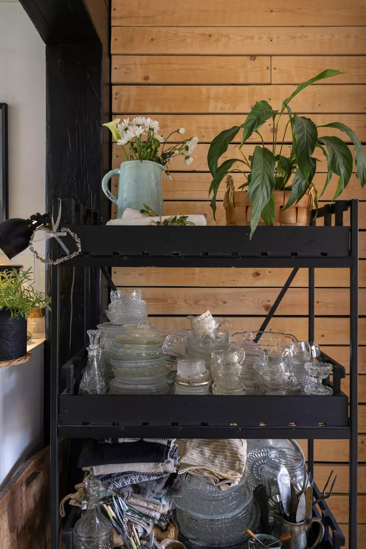 Черный металлический стеллаж также достался семье за бесценок. Меку состоит в районном чате, где люди бесплатно отдают ненужные б/у вещи. Там она и нашла этот стеллаж. Сейчас на его полках хранится реквизит для интерьерных съемок, винтажная посуда, красивые столовые приборы, салфетки и прочий текстиль для сервировки стола.