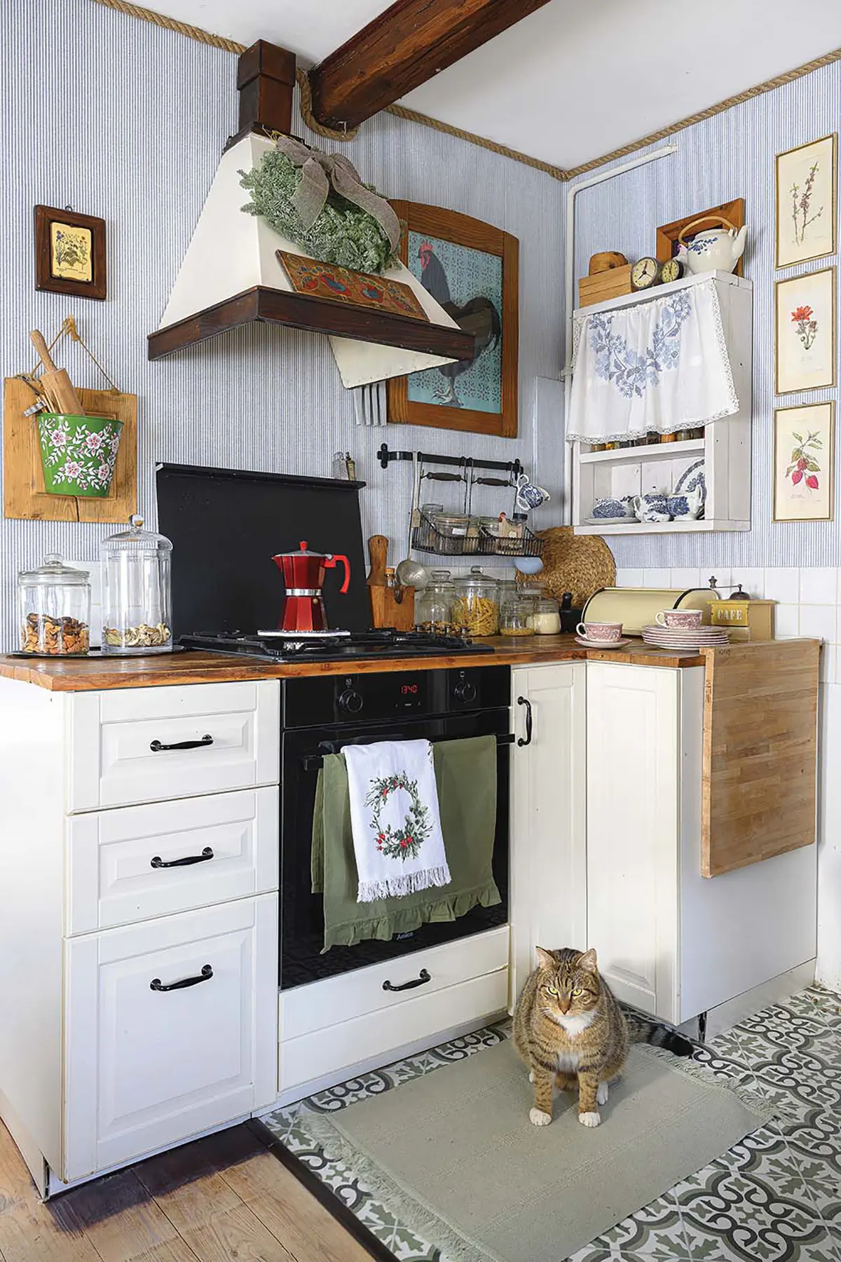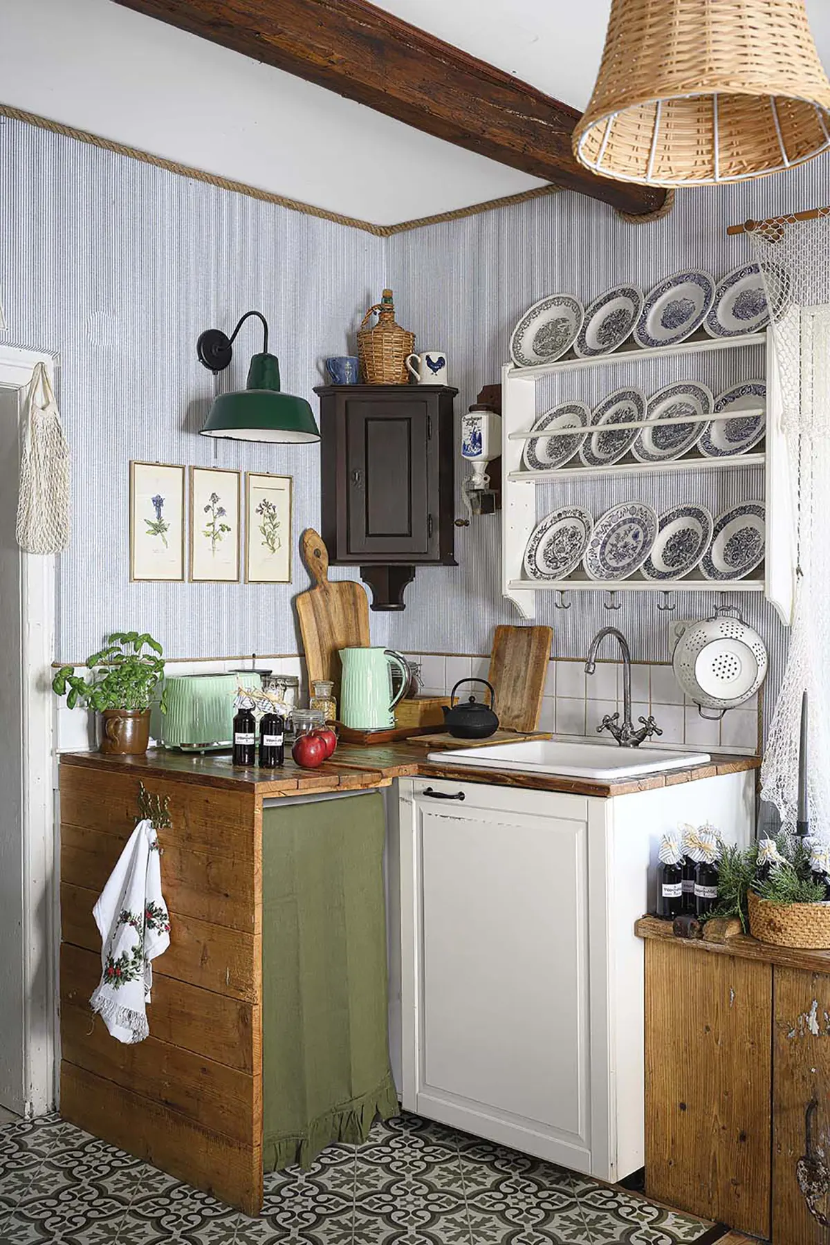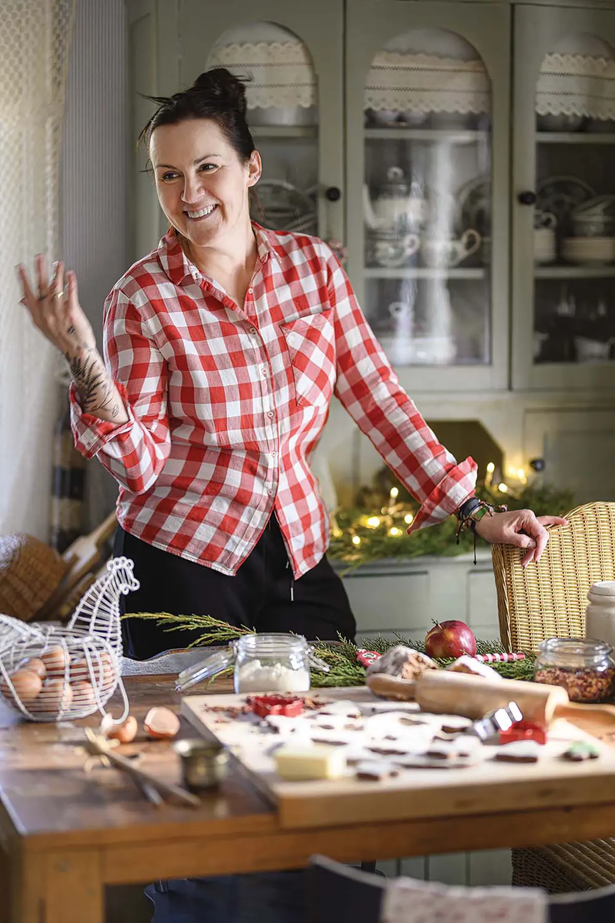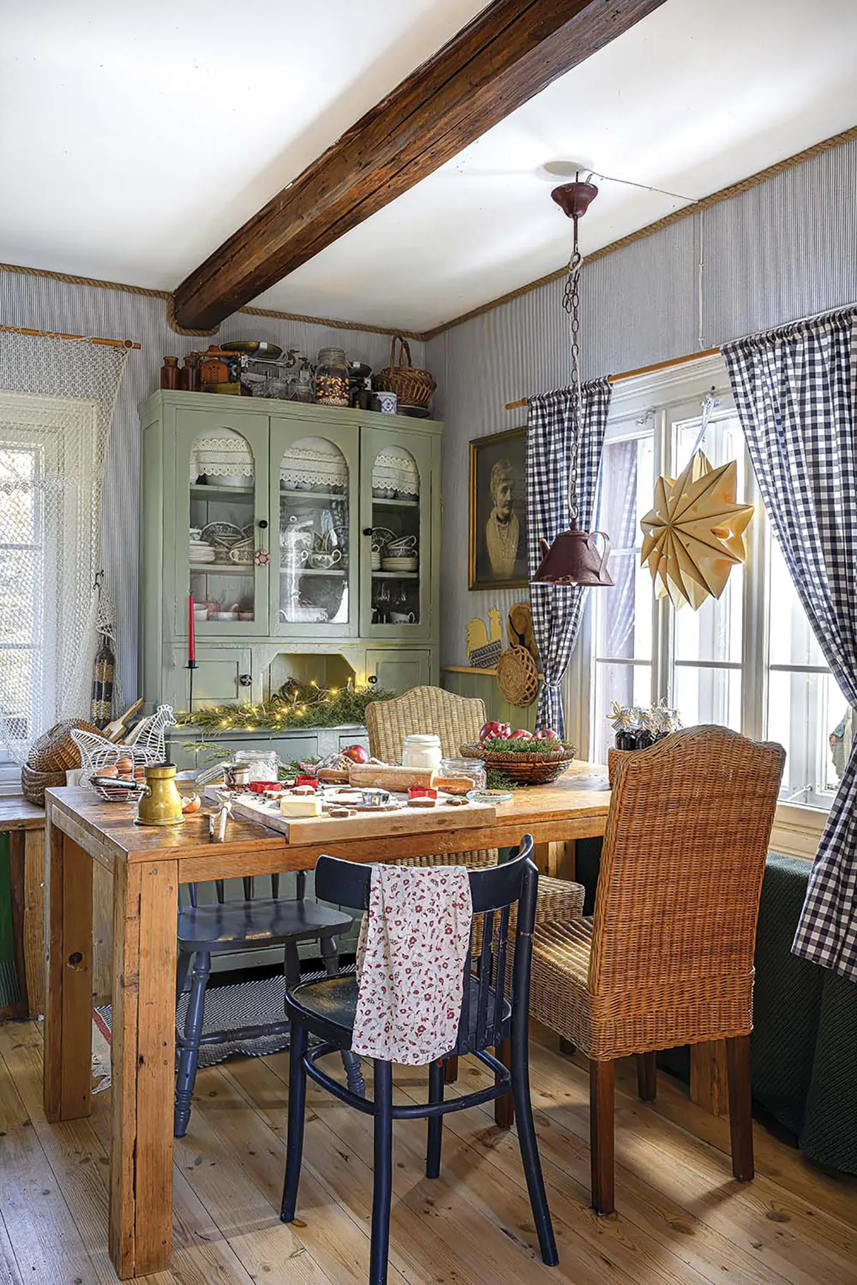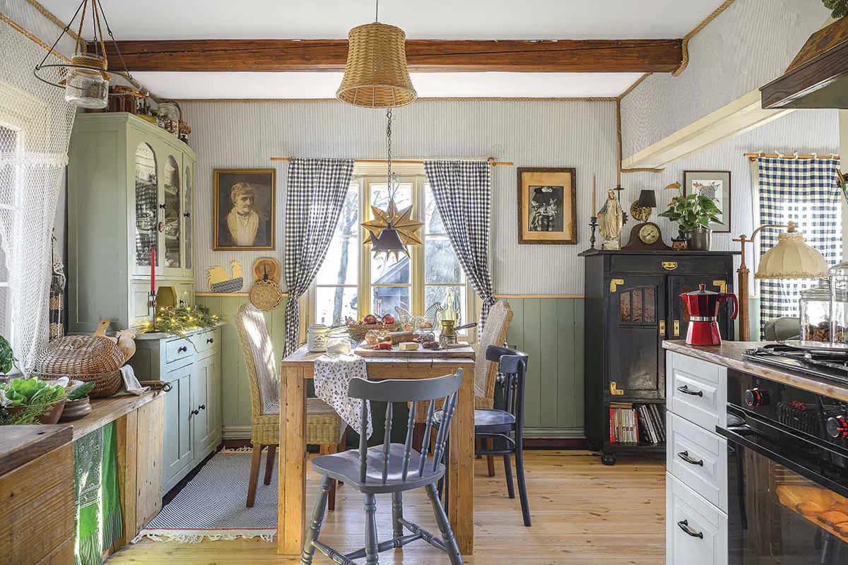 Дерево и все оттенки зеленого — любимые цвета Моники. Она часто шутит, что в интерьере их дома чувствуется «бабушкин стиль». Отсюда клетчатые занавески на окнах и шторки на комодах.