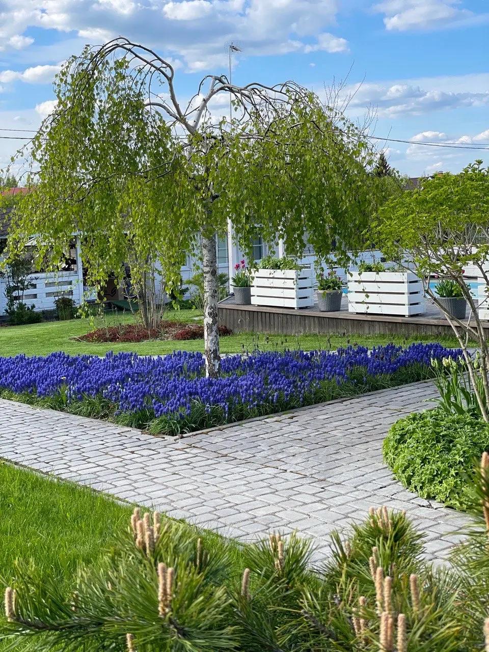 Эту березу посадили на участке в 2015 году. А луковицы мускари (всего около ста штук) Марина высадила в 2020 году. За четыре года поляна очень сильно разрослась — теперь тут около тысячи мускари.