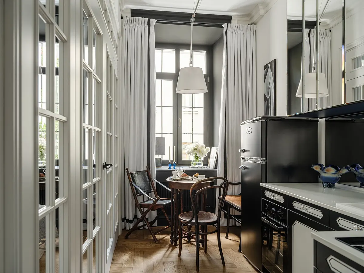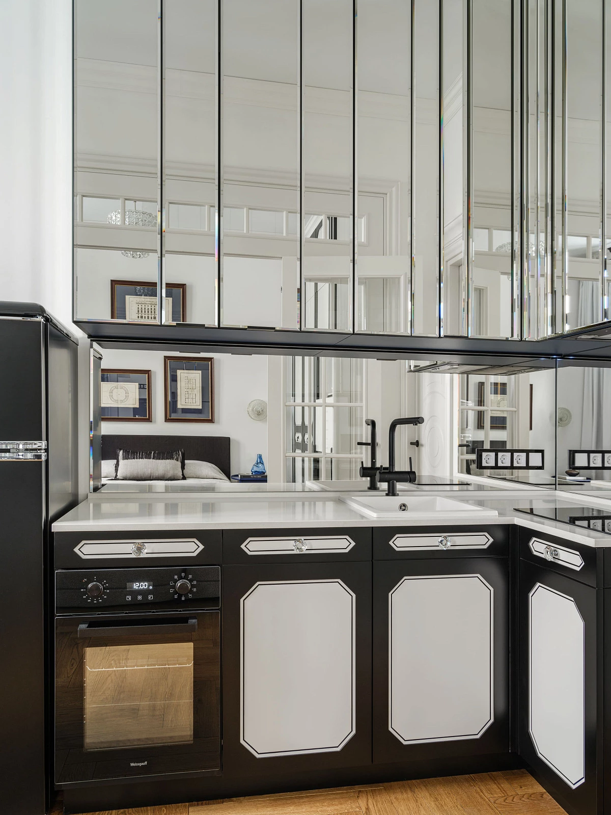 Кстати, именно зеркальная лестница в парижском модном доме и стала прообразом зеркальных фасадов на кухне этой однушки.
