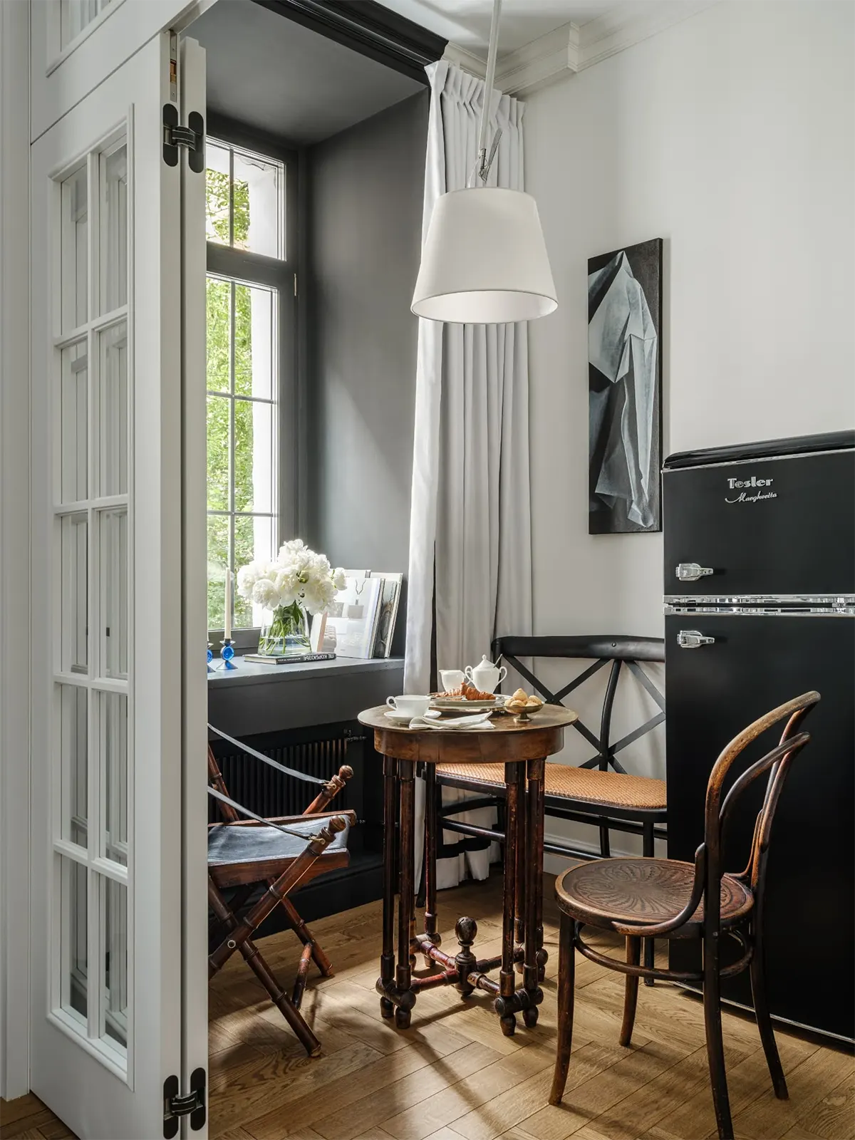 В интерьере можно увидеть интересные предметы мебели с особенной историей. Например, складной стул в обеденной зоне — антиквариат. Его приобрели больше 10 лет назад у Татьяны Гедике, основательницы шоурума винтажной мебели RepeatStory.