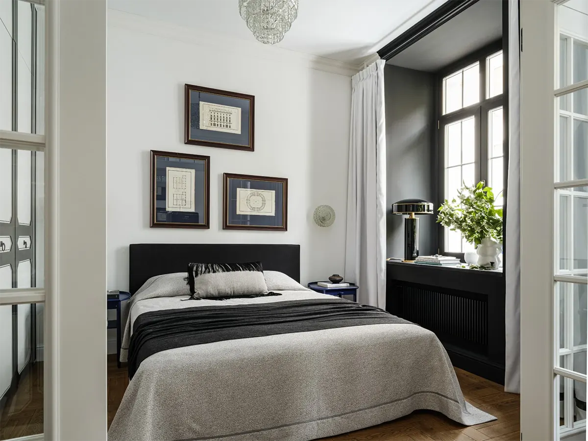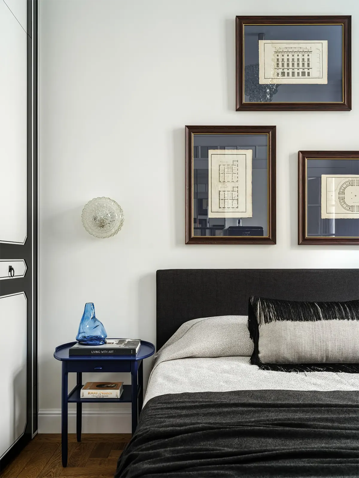 Над изголовьем кровати висят винтажные схемы одного из зданий Парижа.