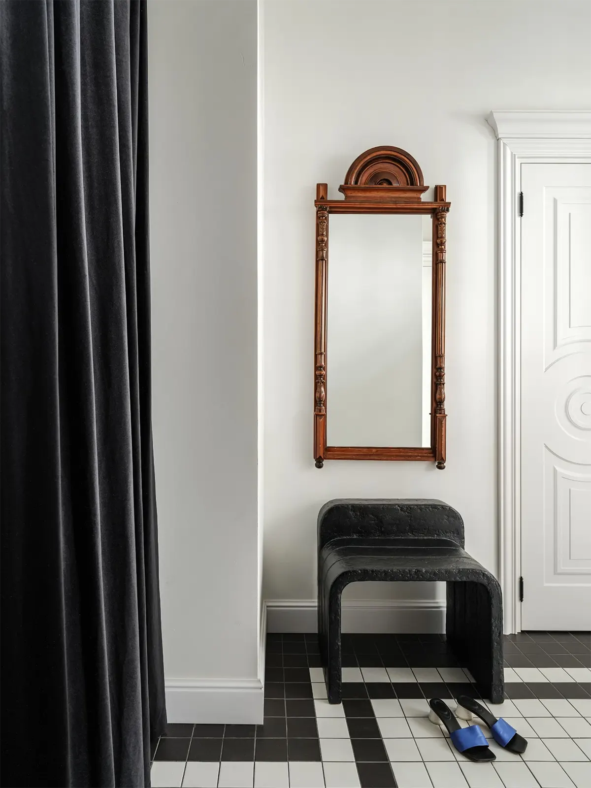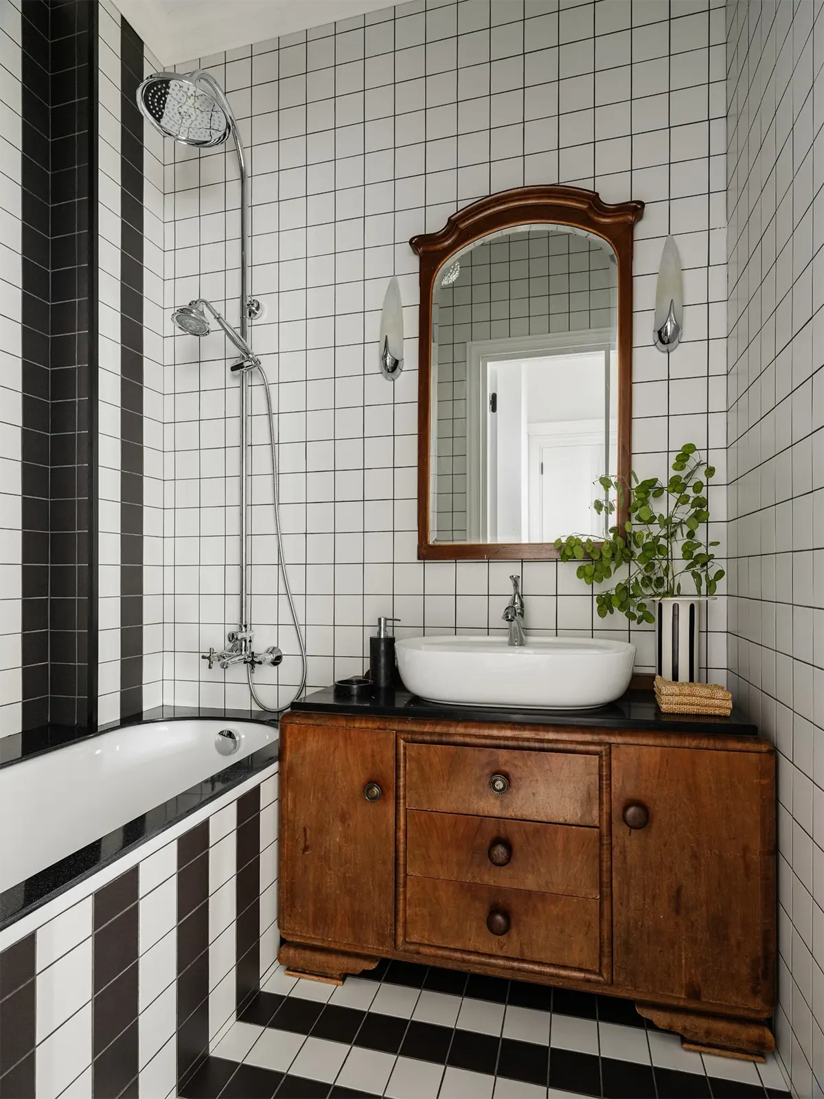 Деревянный комод и зеркало в ванной комнате уравновешивают смелую черно-белую геометрию. Подобные винтажные зеркала в старых деревянных рамах висят и во втором санузле.