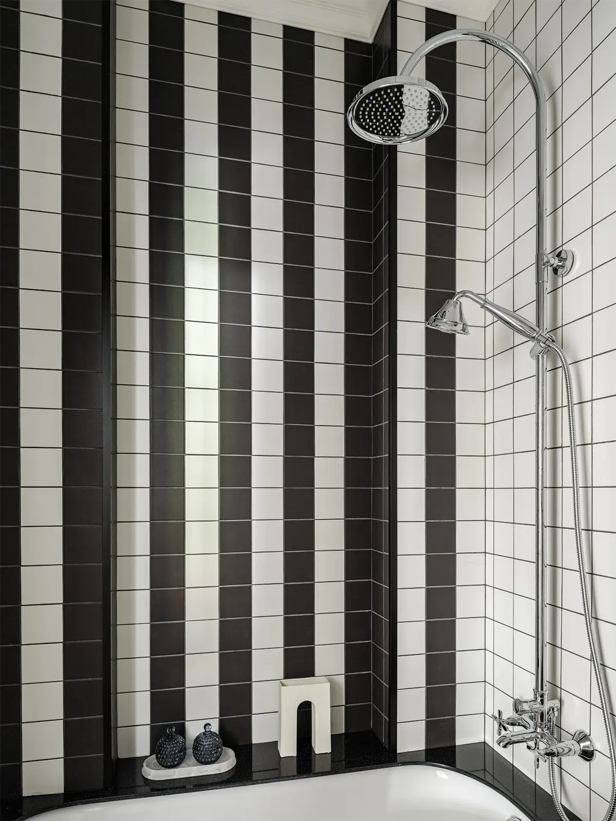 Для ванной комнаты и прихожей выбрали одинаковую черно-белую плитку размером 10 на 10. Этот размер перекликается с плиткой на лестничных клетках в доме.