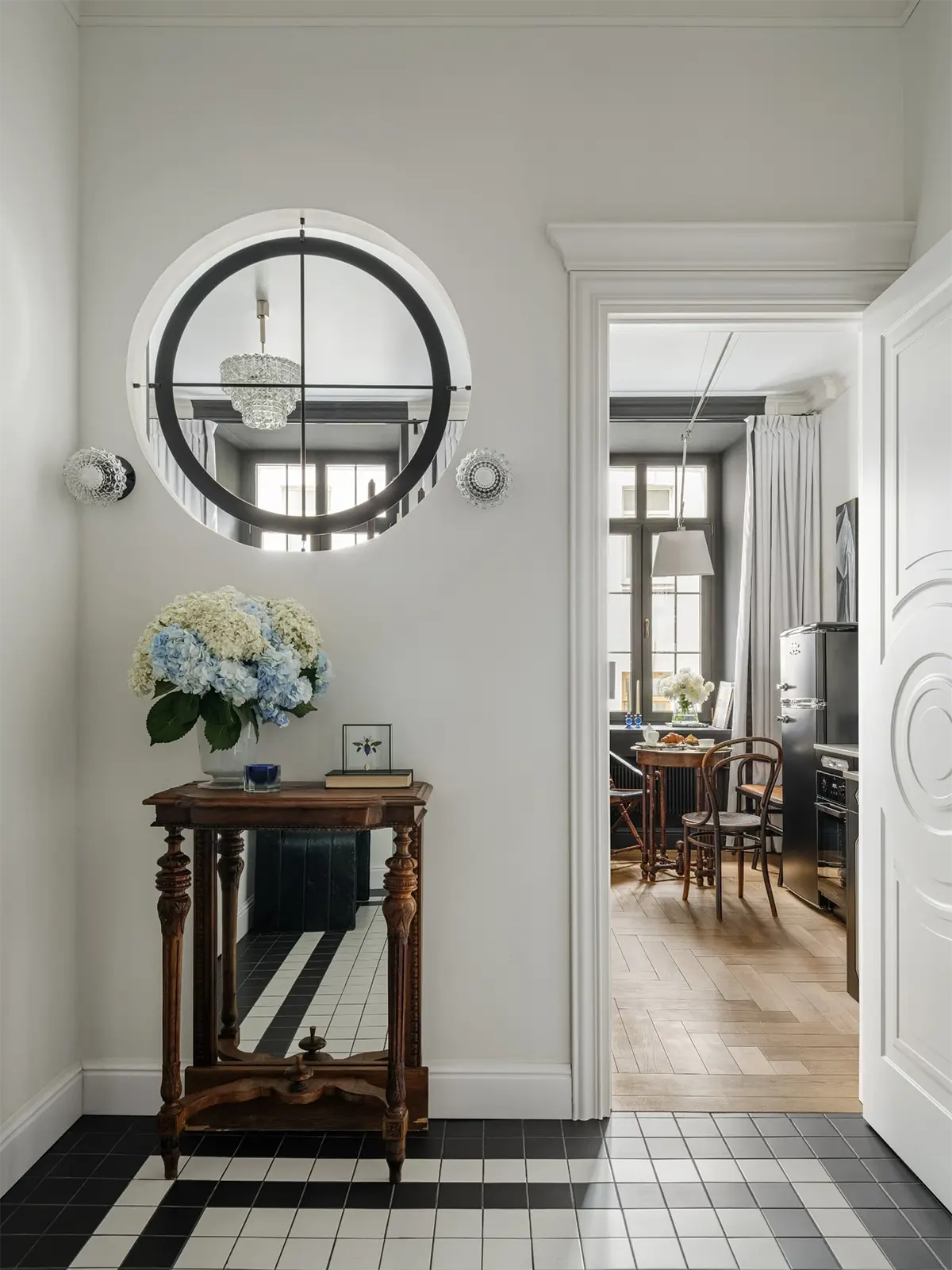 Здесь появилось круглое межкомнатное окно — выразительный акцент, который одновременно стал дополнительным источником естественного света в прихожей. Если приглядеться, то можно увидеть, что стекло закреплено на специальные тросы. Это создает эффект парения стекла в пространстве.