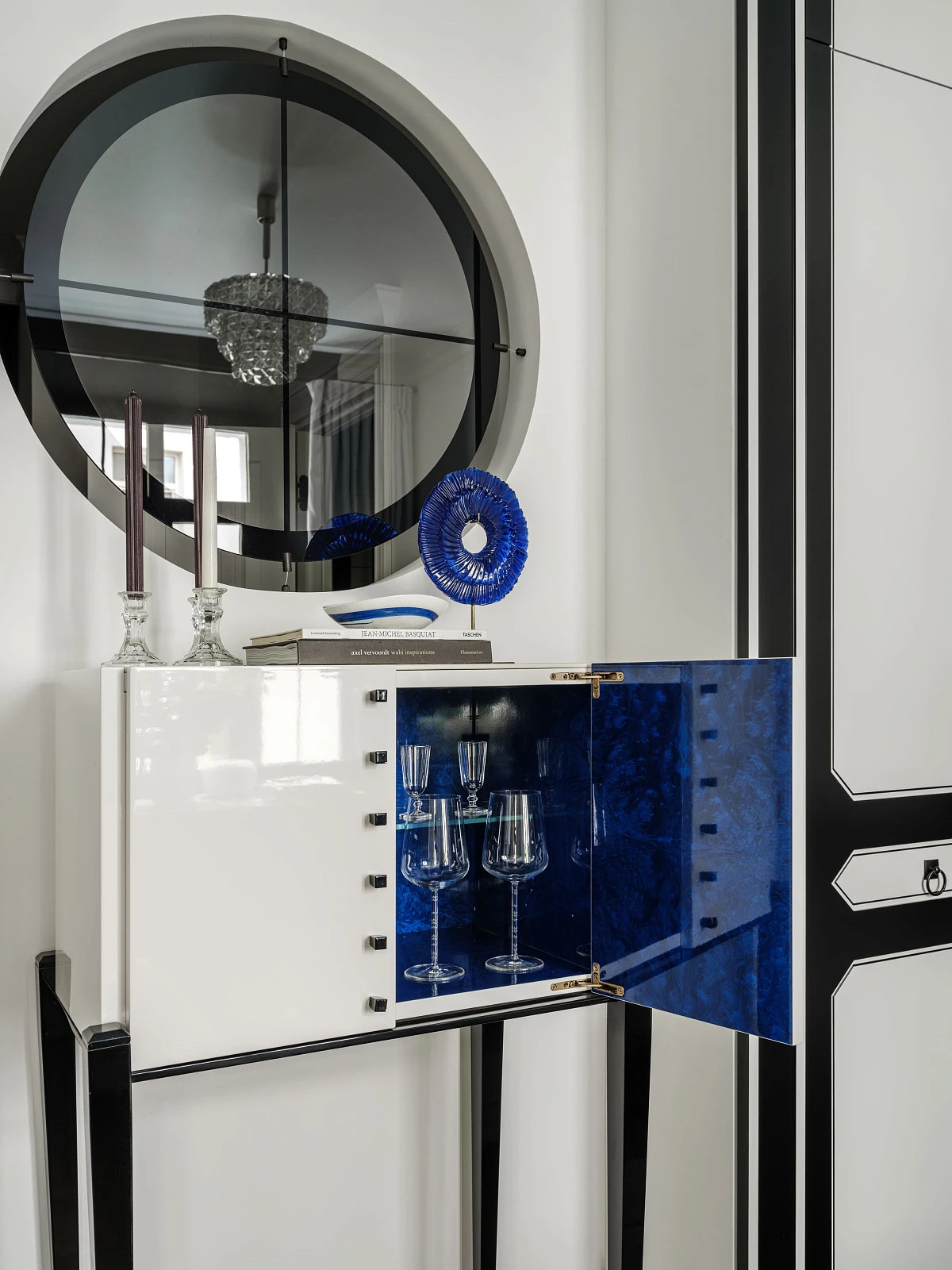 Под окном разместили комод-бар BOY от итальянского бренда Cesare Ferrari, который выглядит как арт-объект. У него высокие ножки-каблуки, глянцевые фасады и ярко-синяя внутренняя отделка. Его изготовили в 2018 году и позже выставляли на Венецианской биеннале.