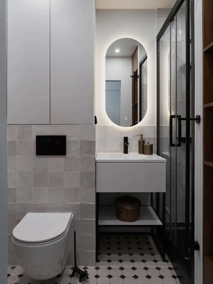 Пол в санузле и зону прихожей выделили плиткой, которая похожа на метлахскую.