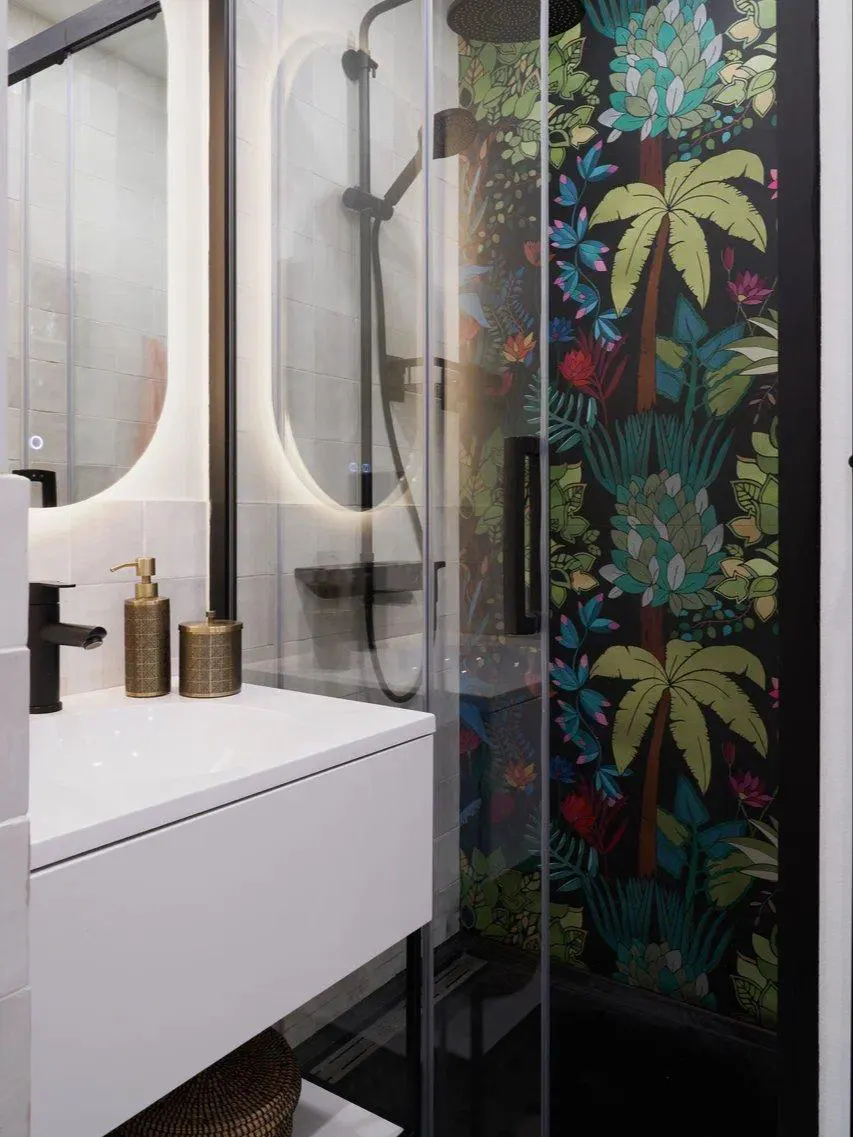 Яркое панно от итальянского бренда 41zero42 на стене в душевой стало отправной точкой всего интерьера.